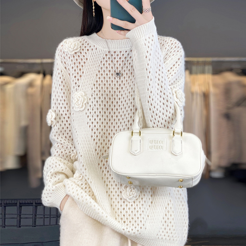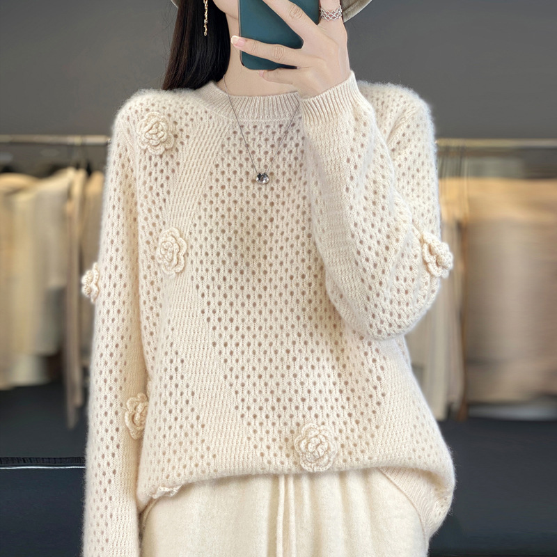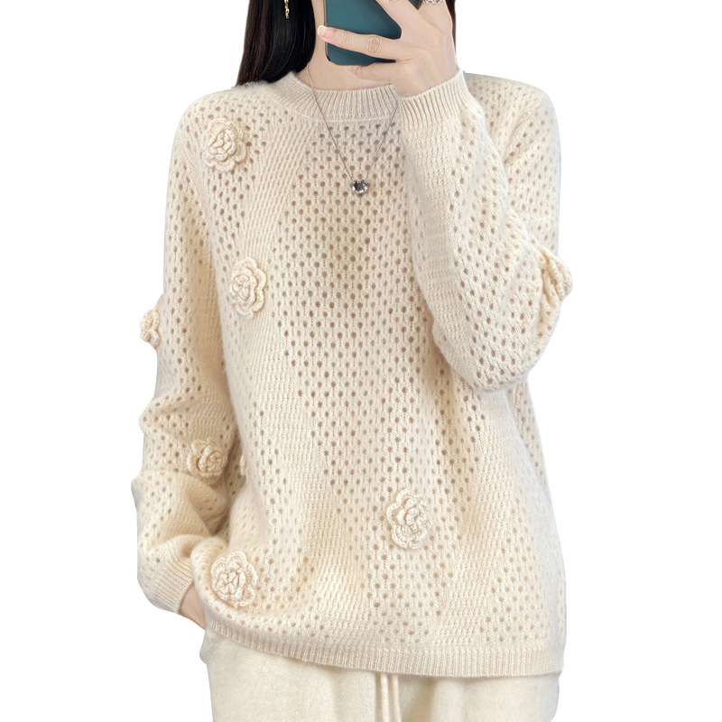 100%纯羊毛2025秋冬新款女式宽松圆领立体钩花镂空毛衣打底针织衫