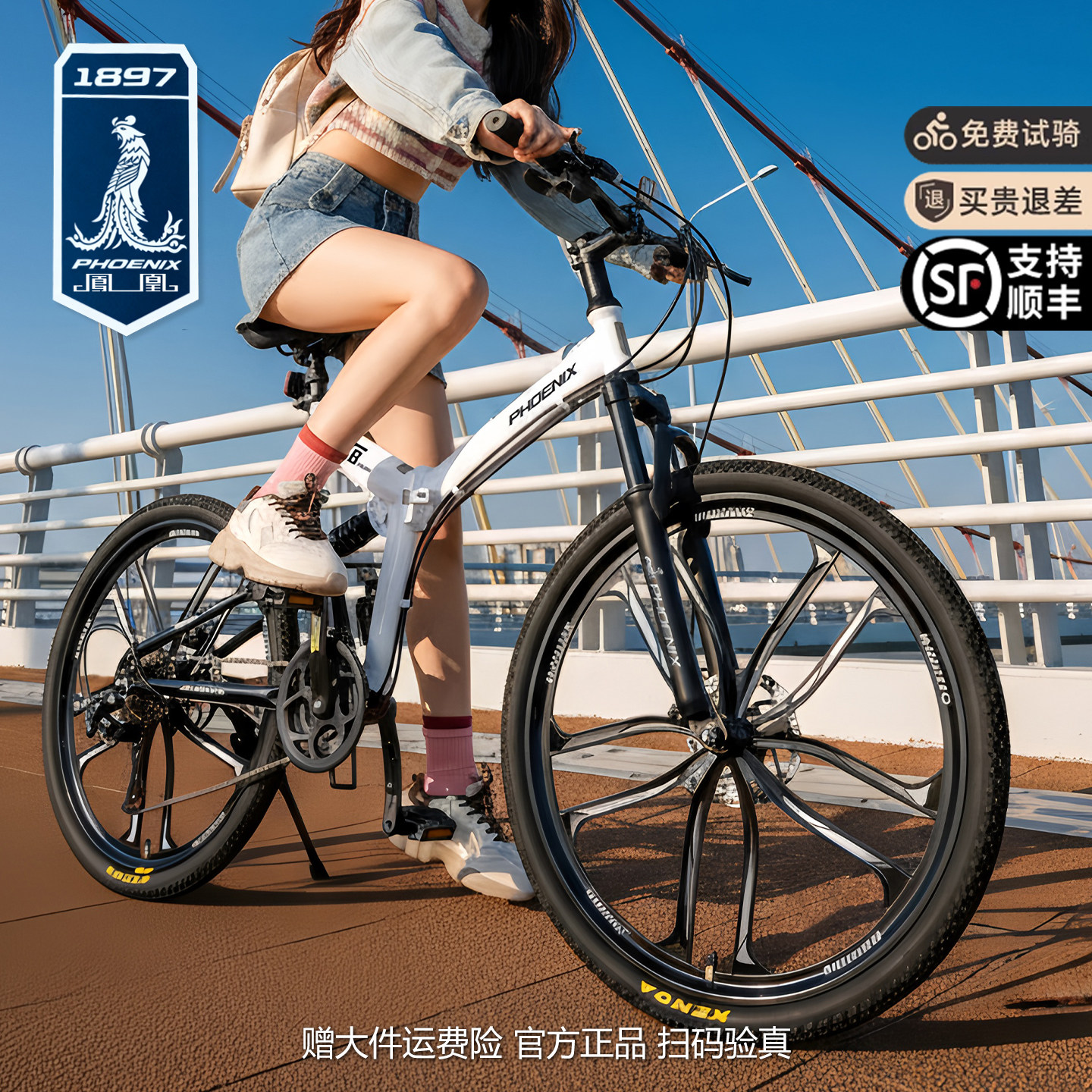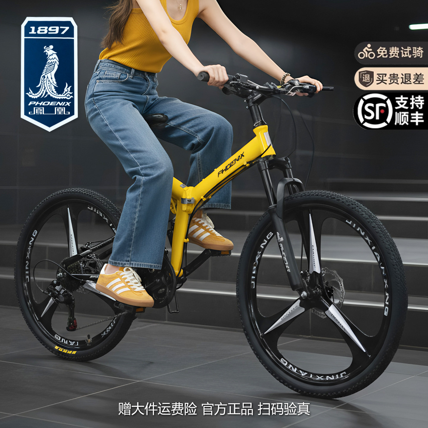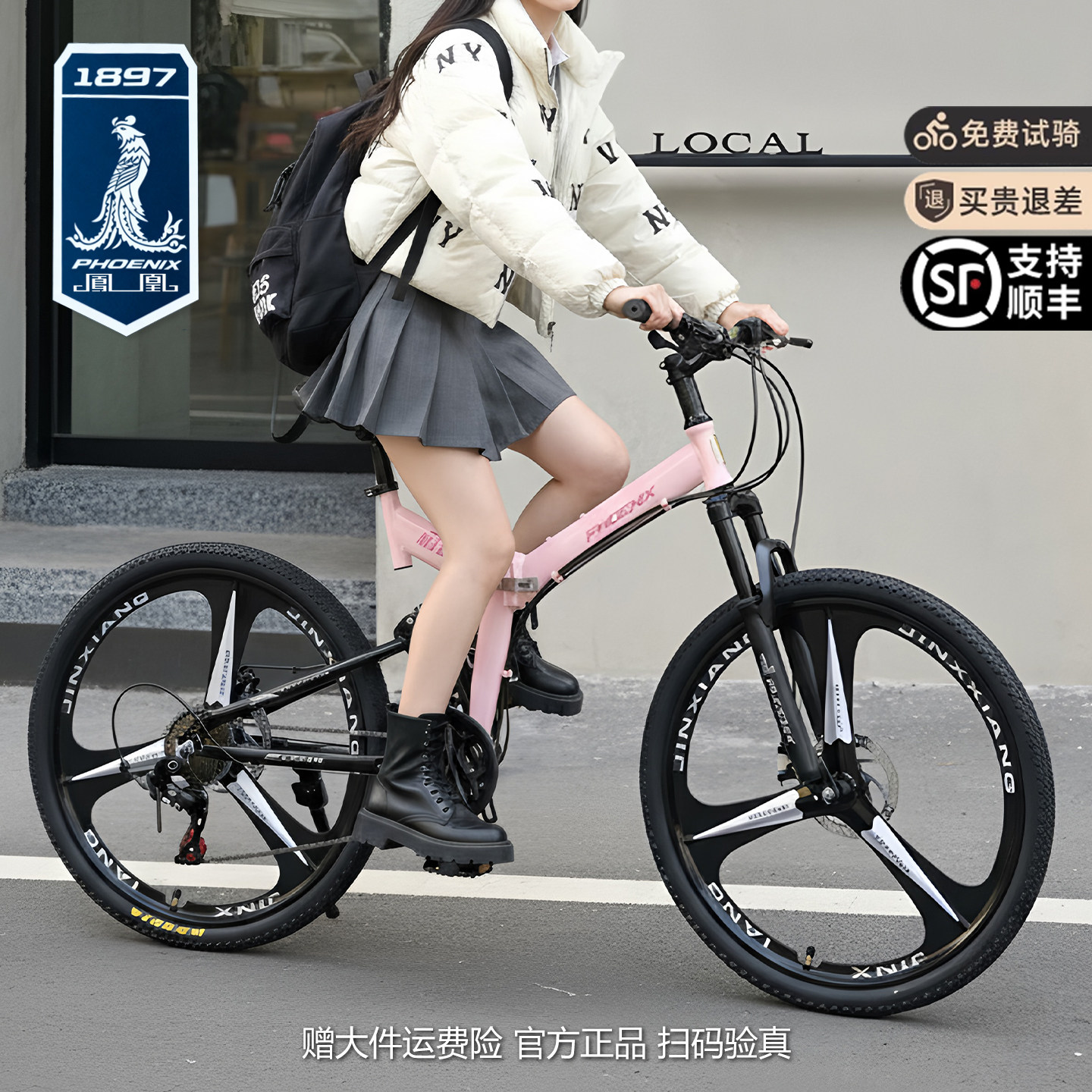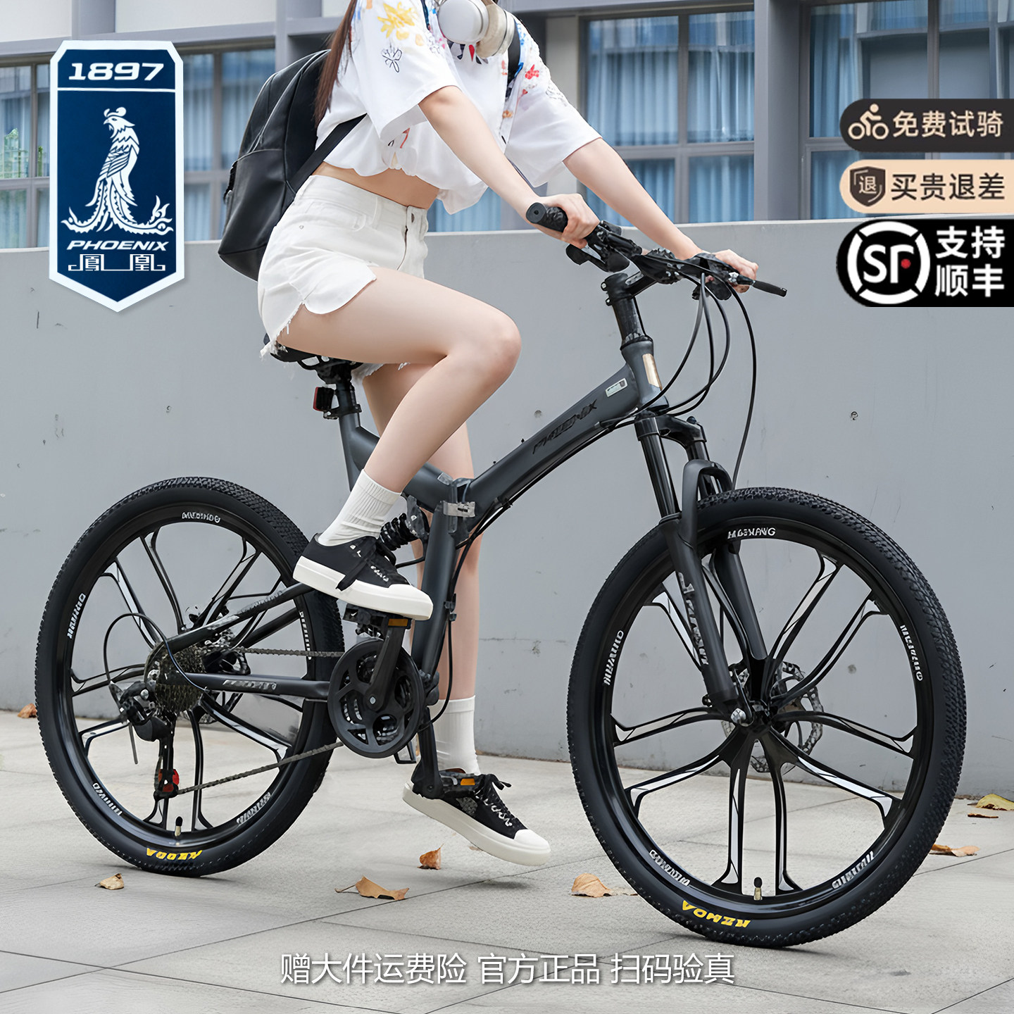 凤凰正品软尾折叠山地自行车男女青少年变速越野减震单车学生赛车