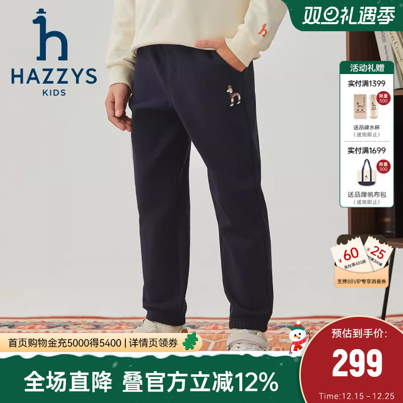 hazzys哈吉斯童装男女童裤子2024冬新中大童一体绒舒适保暖长裤
