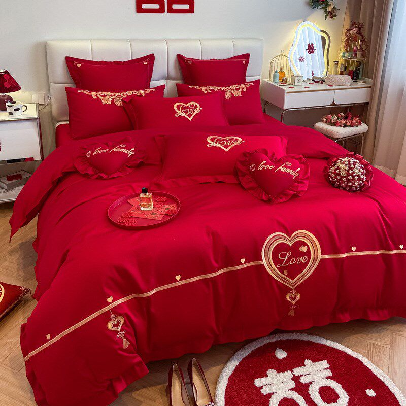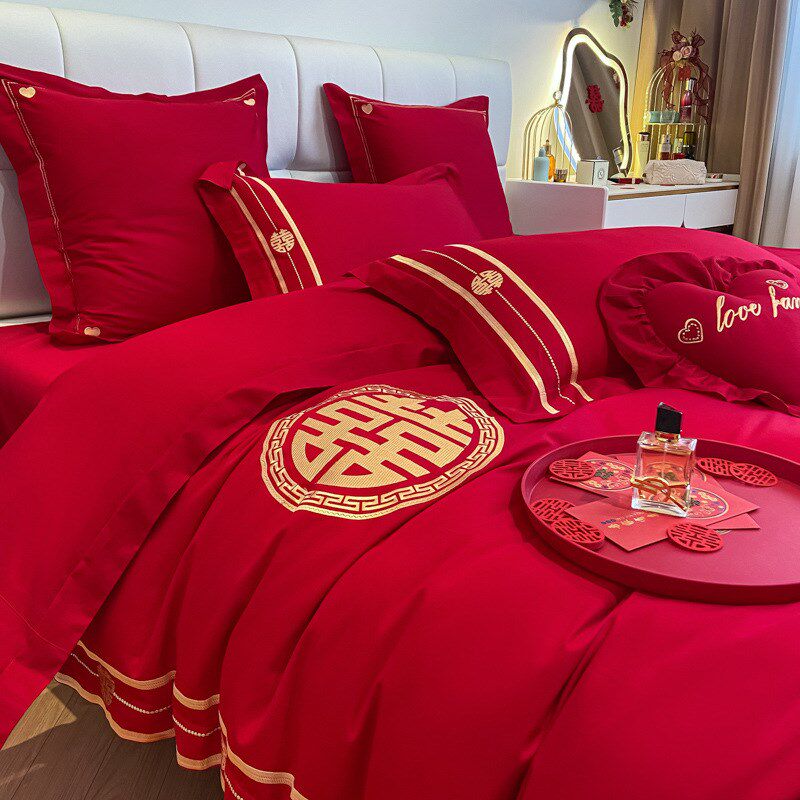 婚庆刺绣四件套中式全棉结婚陪嫁床单被套大红Y色床上用品