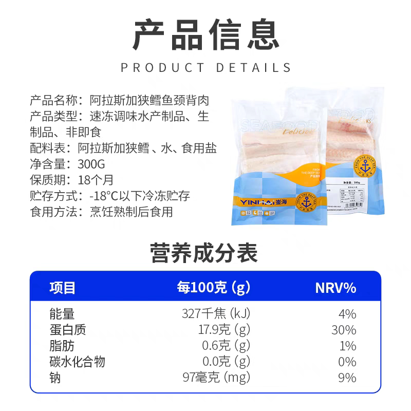 鳕鱼颈背肉去皮去刺无添加剂无冰衣免处理阿拉斯加鳕鱼肉顺丰包邮