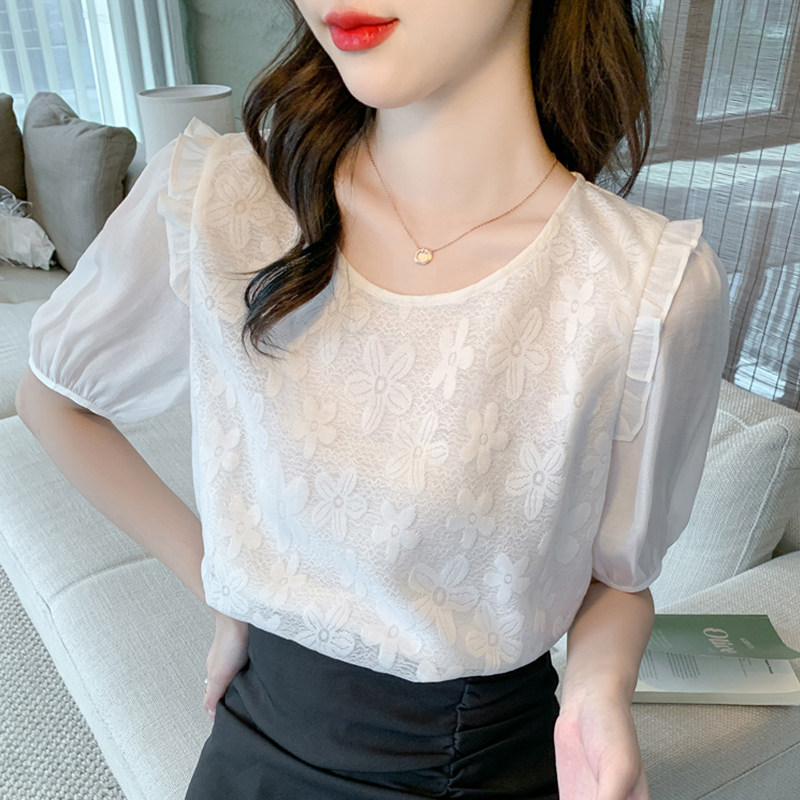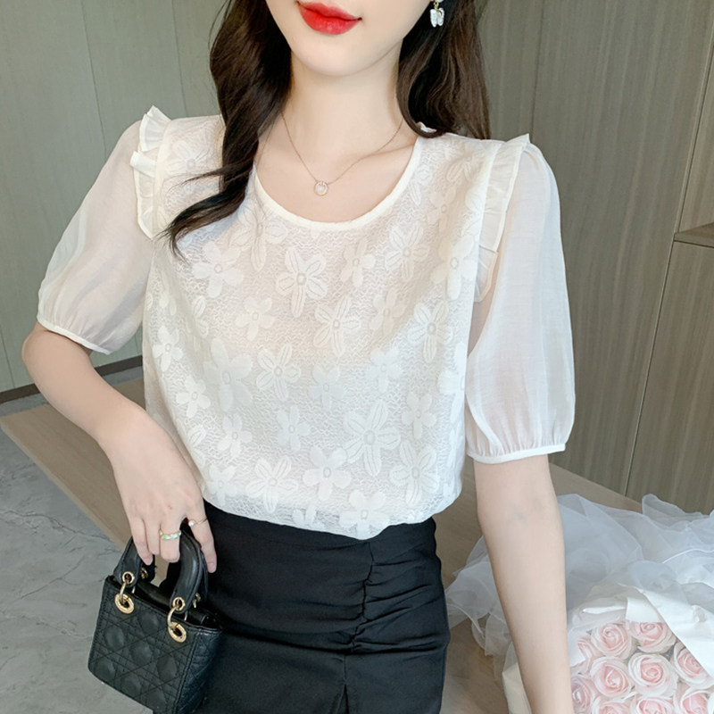 设计感泡泡袖圆领蕾丝t恤2025夏季新款大码女装独特别致雪纺上衣