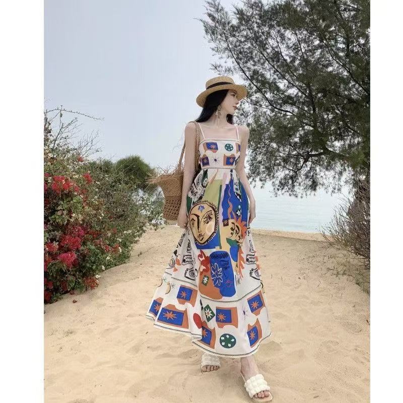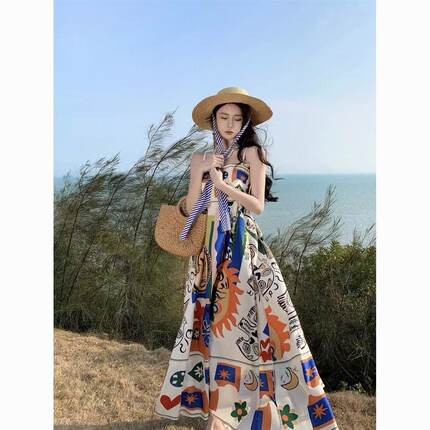 民族风涂鸦印花吊带连衣裙女2025春夏新款设计感小众简约百搭长裙