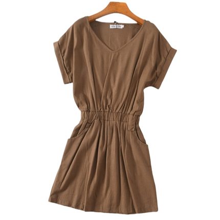 清~文艺风森女系百搭纯色亚麻棉麻短袖连衣裙短裙夏装