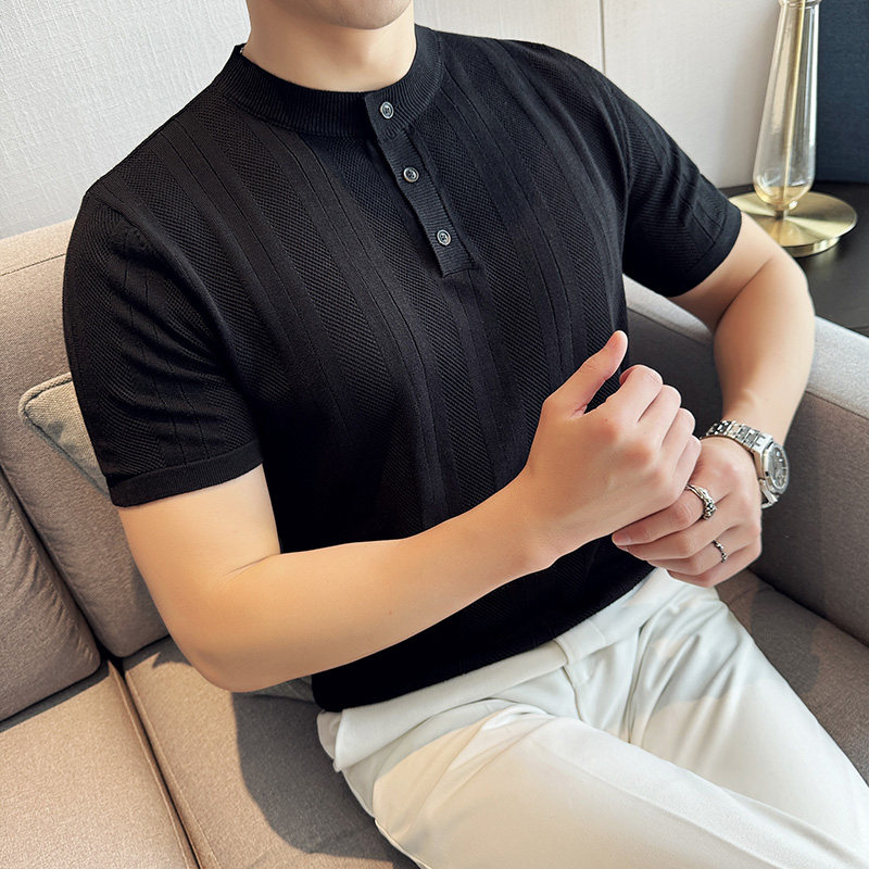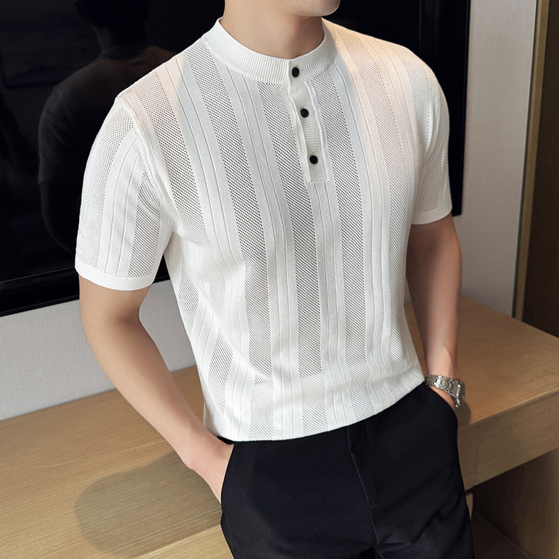 新中式立领Polo衫男短袖夏季薄款冰丝镂空针织高级感条纹半袖t恤