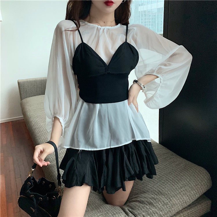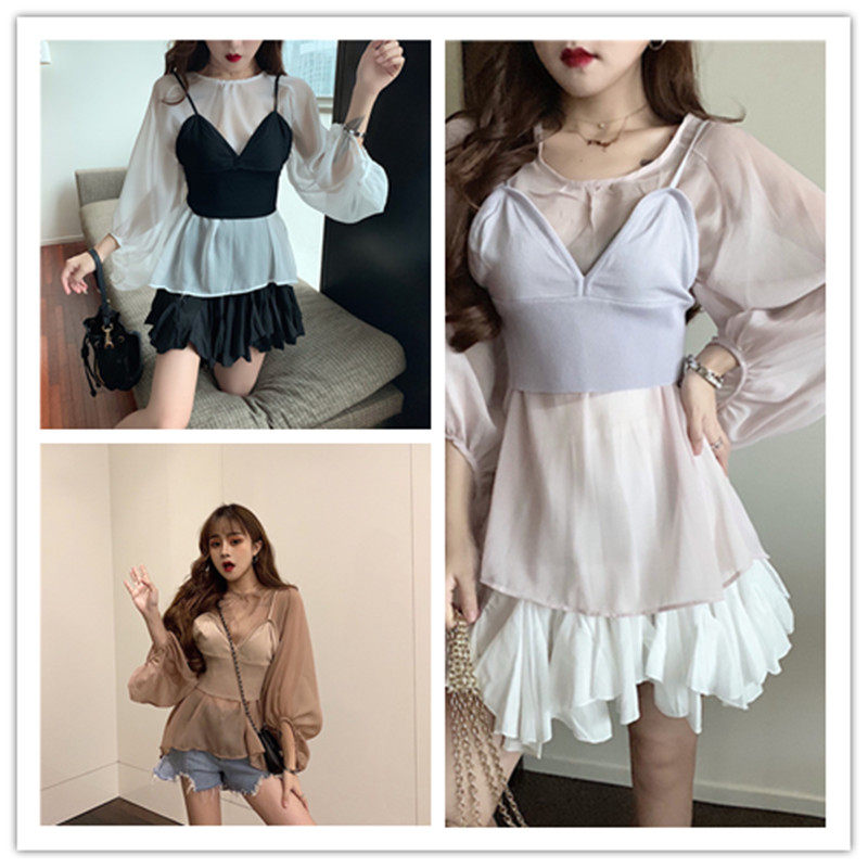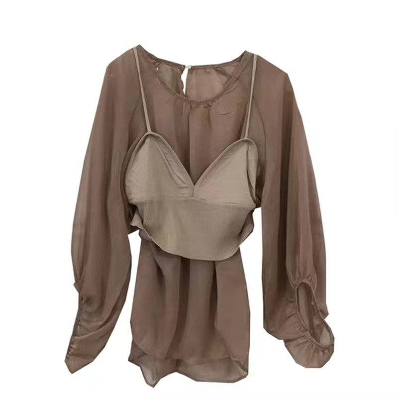 网红chic很仙的咖色雪纺衫洋气灯笼袖长袖上衣+针织吊带两件套装