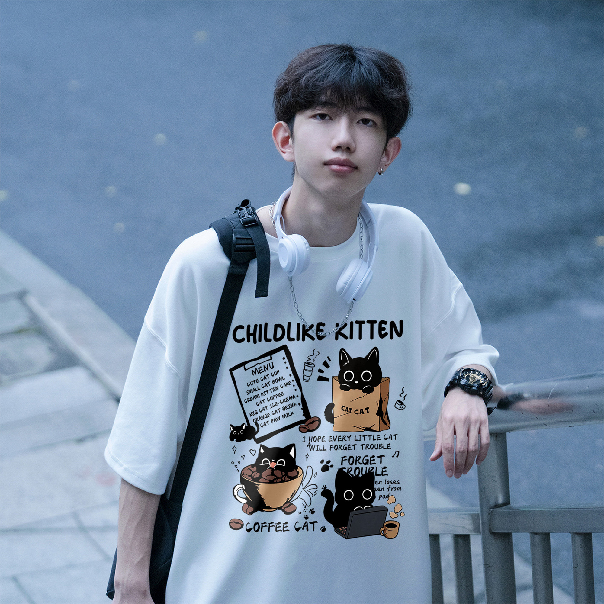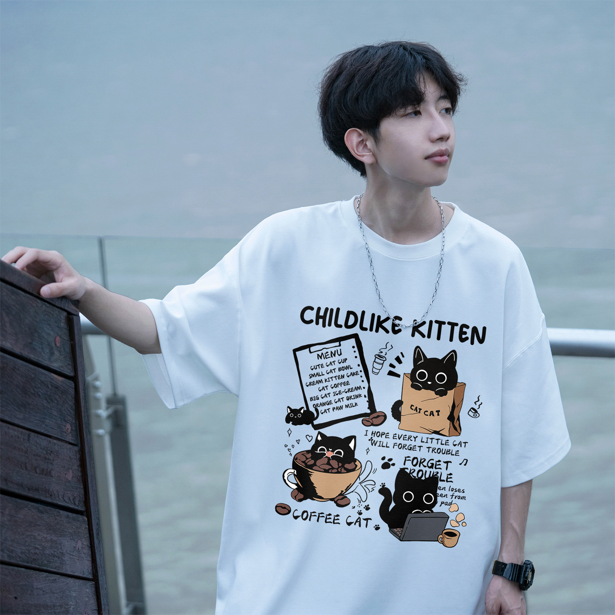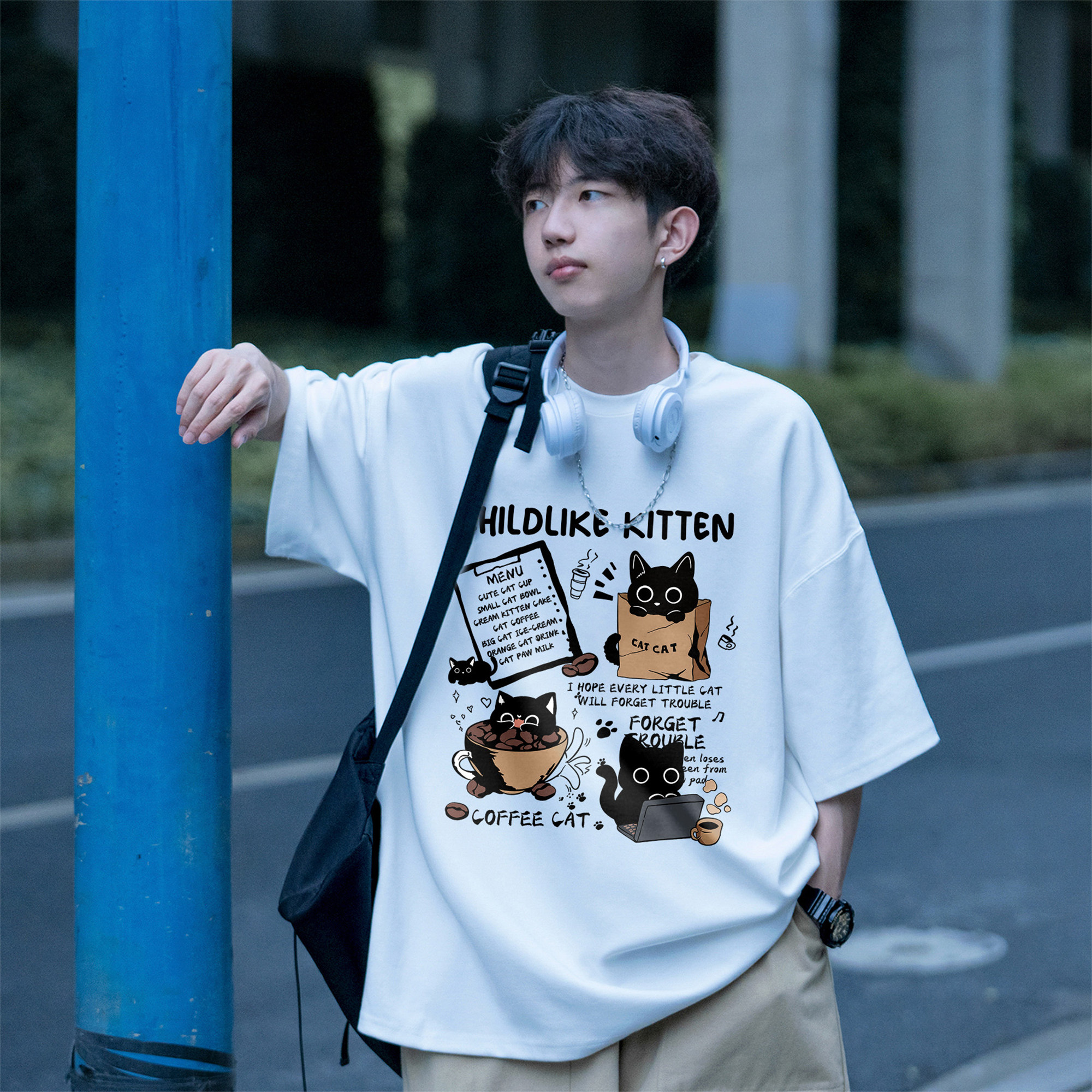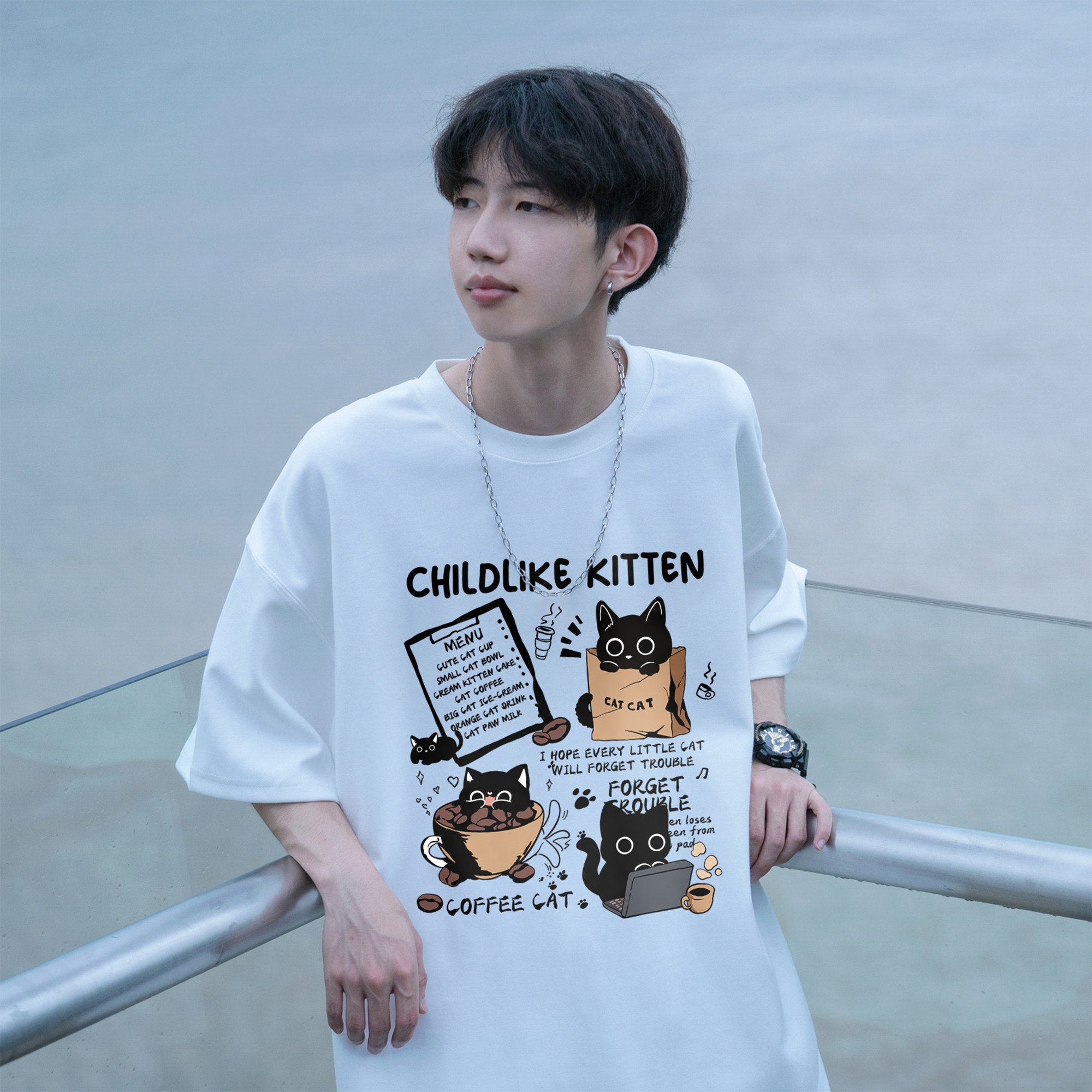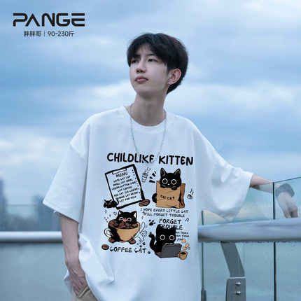 胖胖哥2025新款纯棉卡通猫咪印花短袖百搭T恤男夏季大码宽松上衣