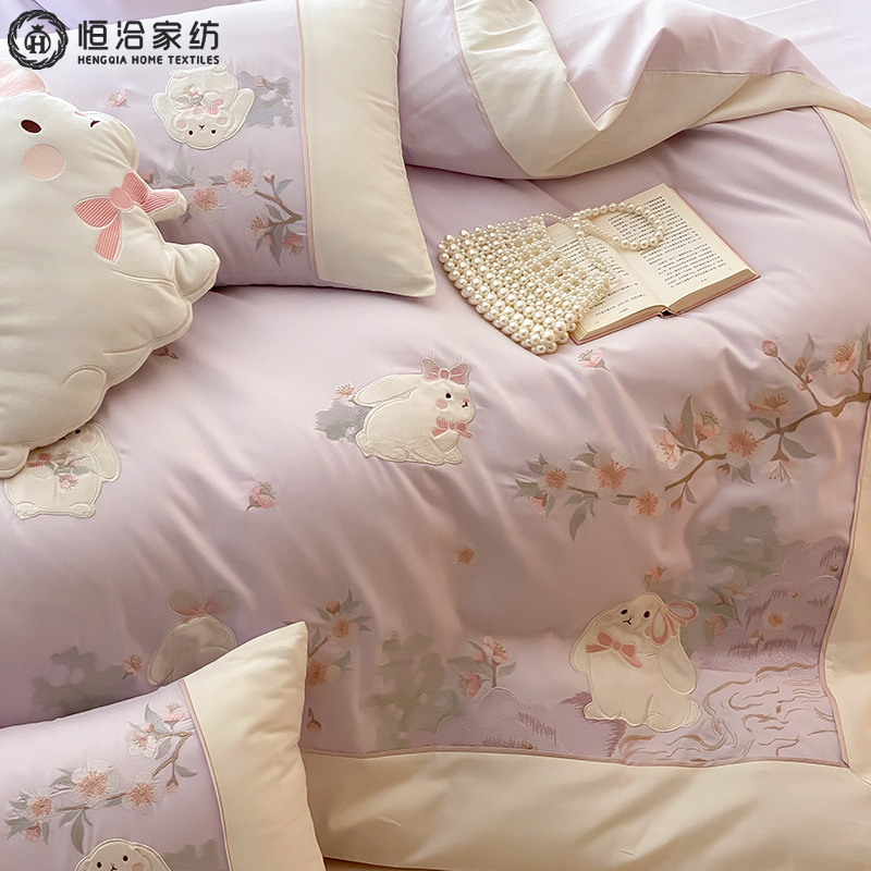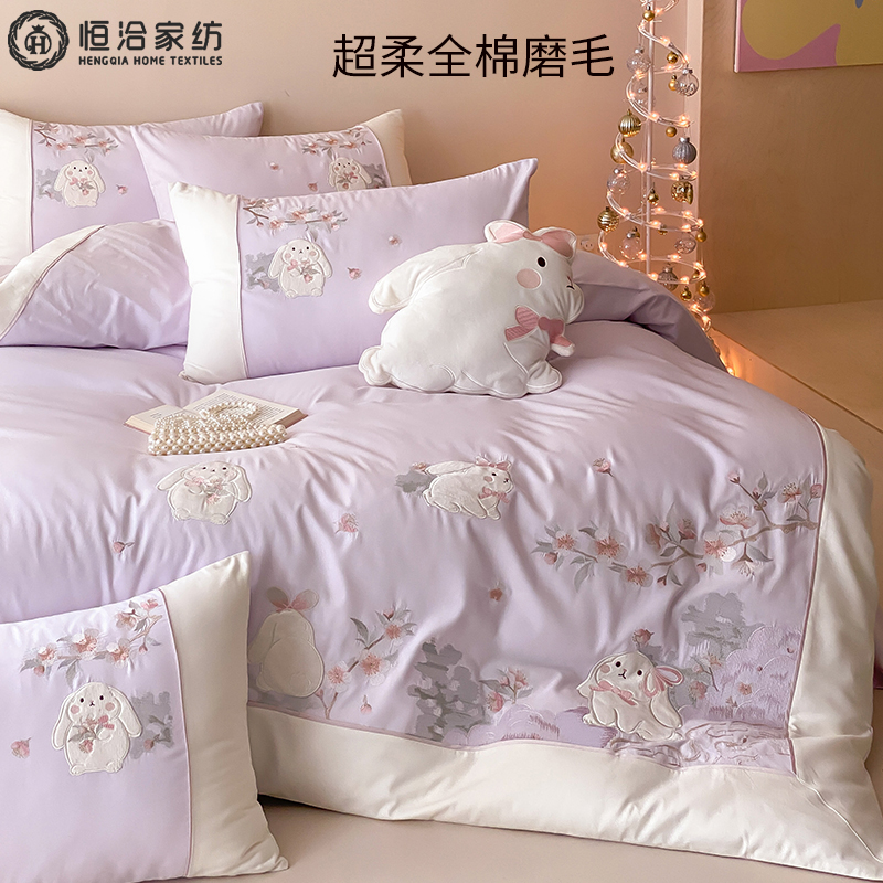 秋冬新款全棉磨毛四件套超柔卡通风儿童兔子刺绣加厚纯棉被套床品