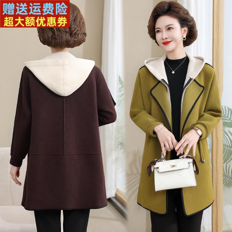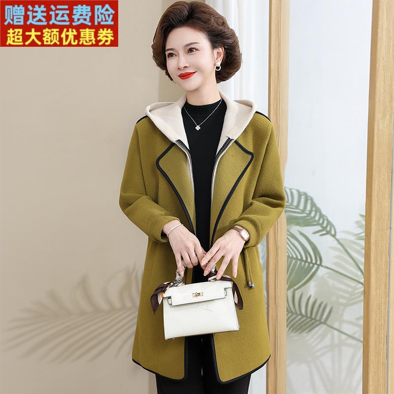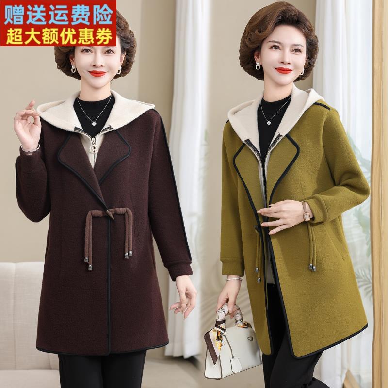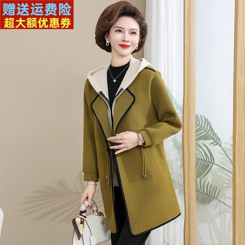 秋冬时尚减龄妈妈大衣连帽修身大码中长款假两件双面绒女外套休闲