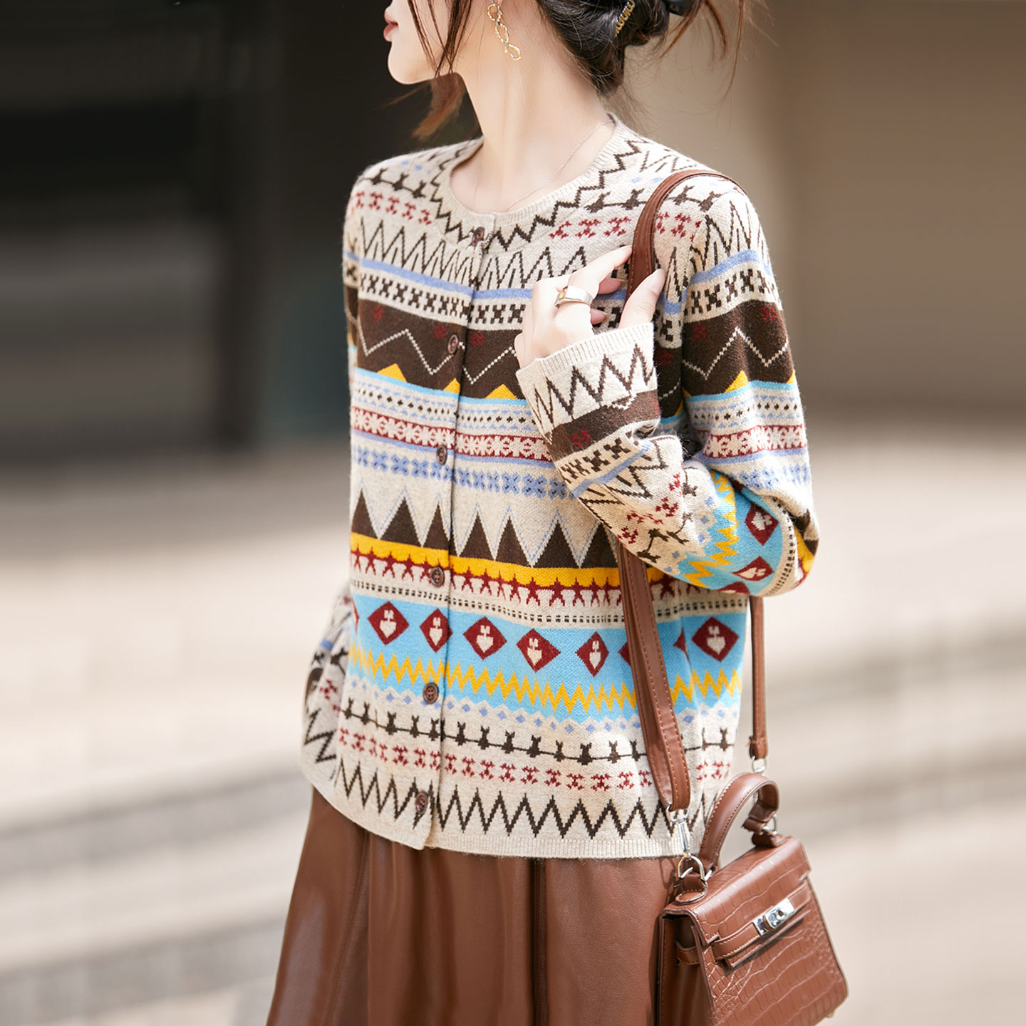 时尚圆领薄款显瘦提花开衫外套女士秋冬新款宽松洋气针织毛衣外搭