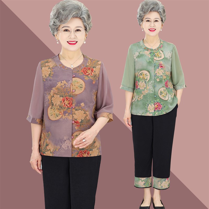 胖奶奶夏装两件套装新款中老年人女妈妈夏季中式雪纺短袖衬衫大码