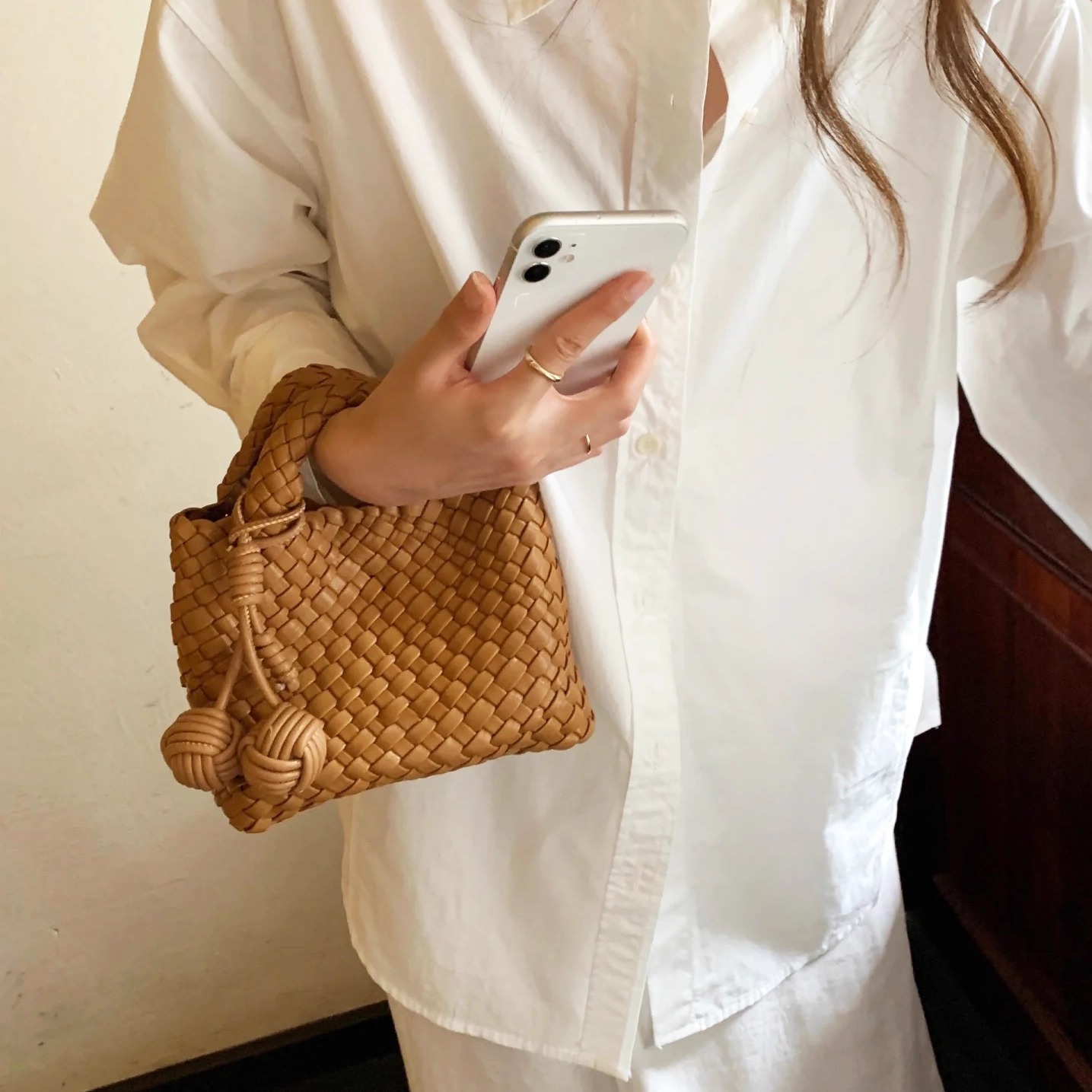 真皮手工编织菜篮子包链条斜挎包