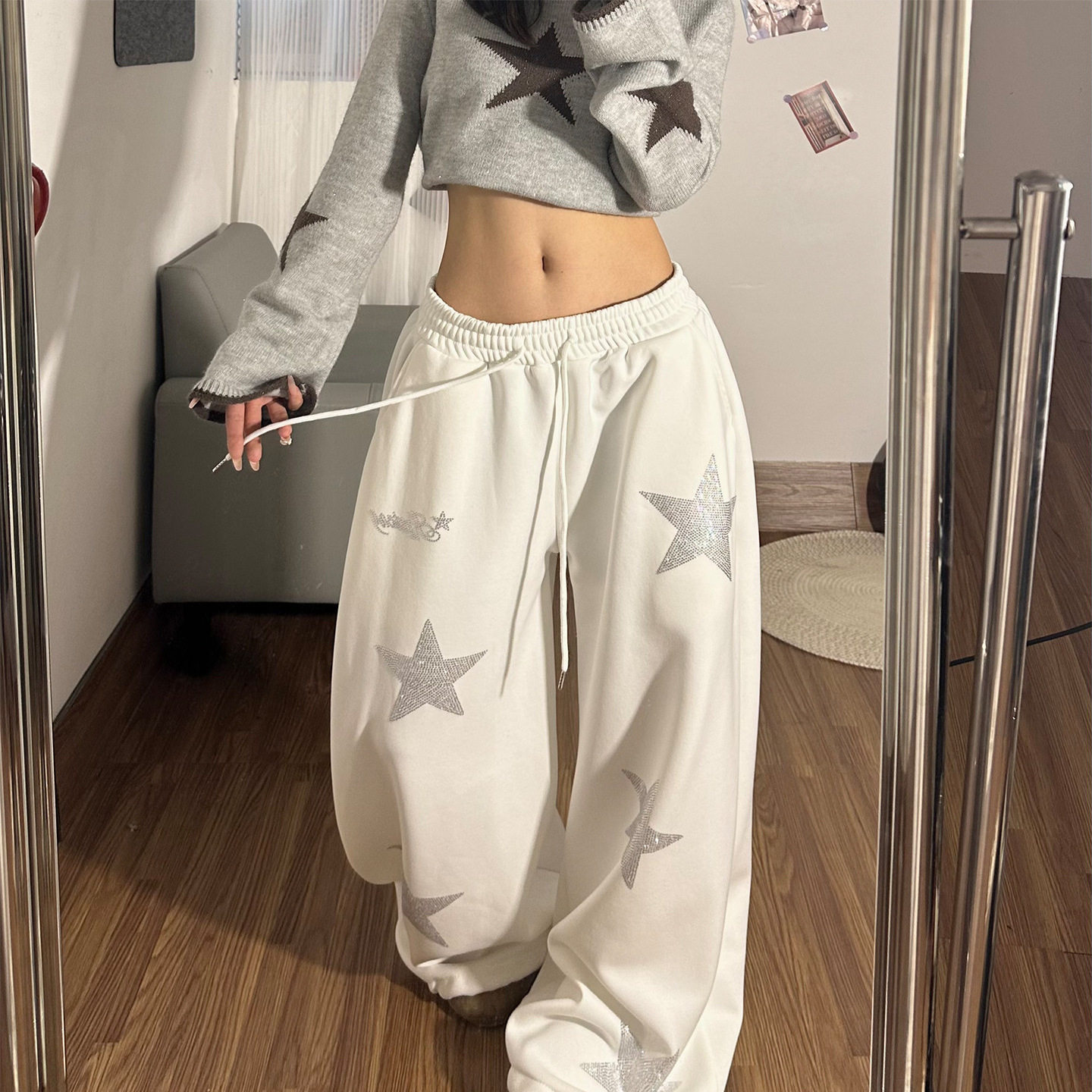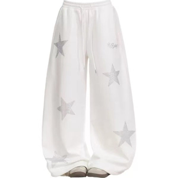 大码美式烫钻星星休闲卫裤女2026春季新款胖mm松紧抽绳显瘦阔腿裤