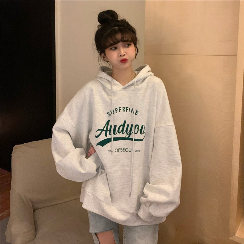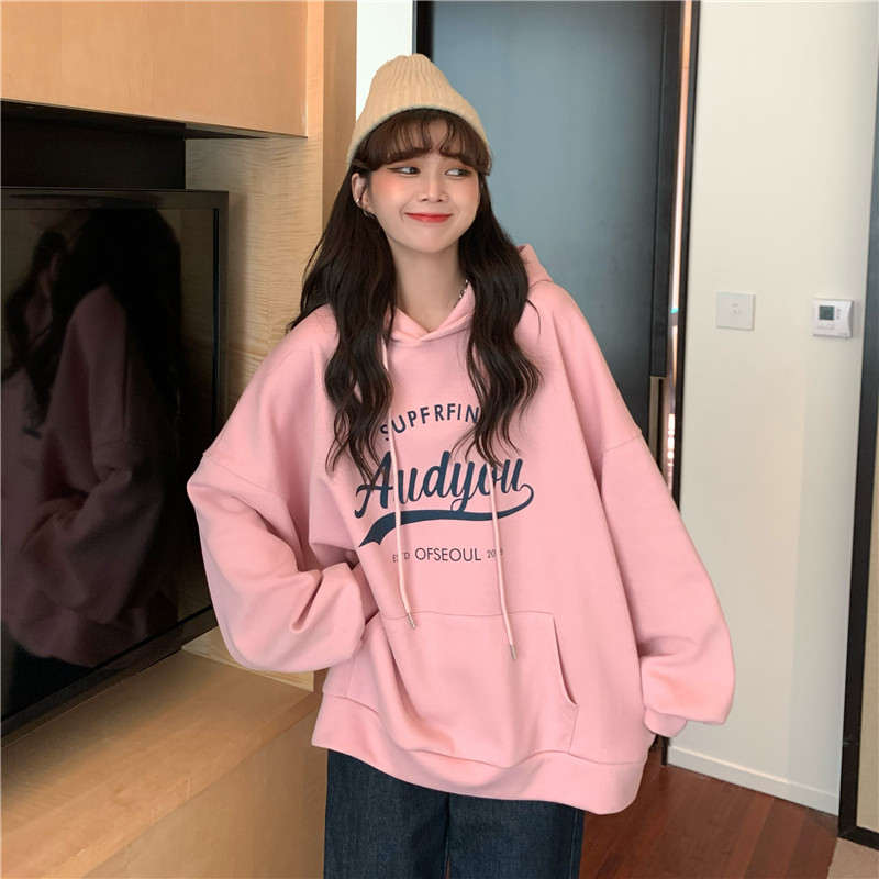 韩版原宿风简约字母印花连帽卫衣女秋冬款宽松bf慵懒风学生上衣男