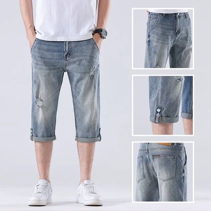 破洞牛仔短裤男士夏季薄款修身直筒休闲中裤马裤潮流休闲七分裤子
