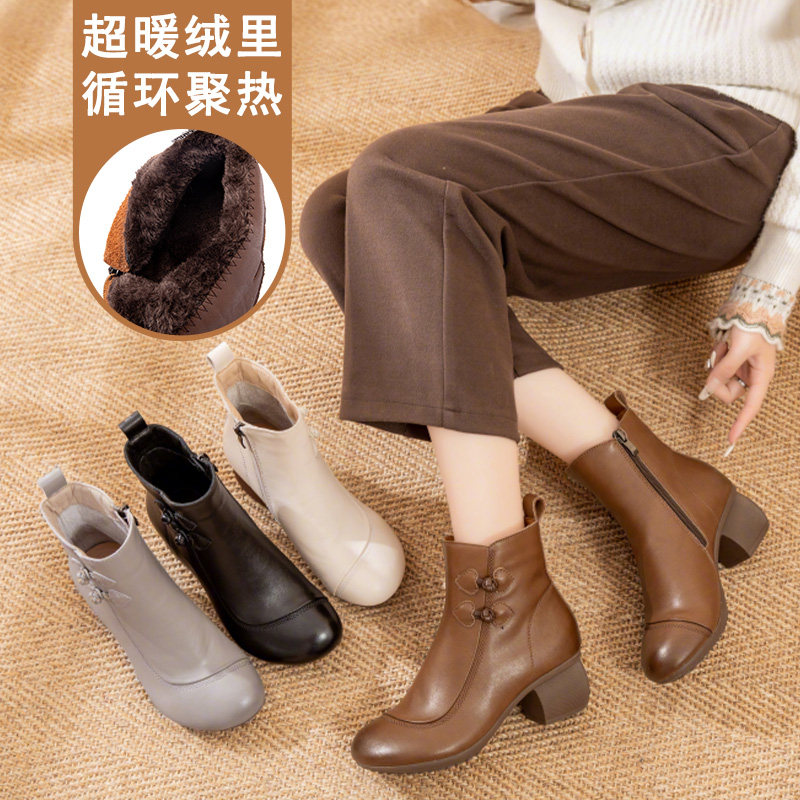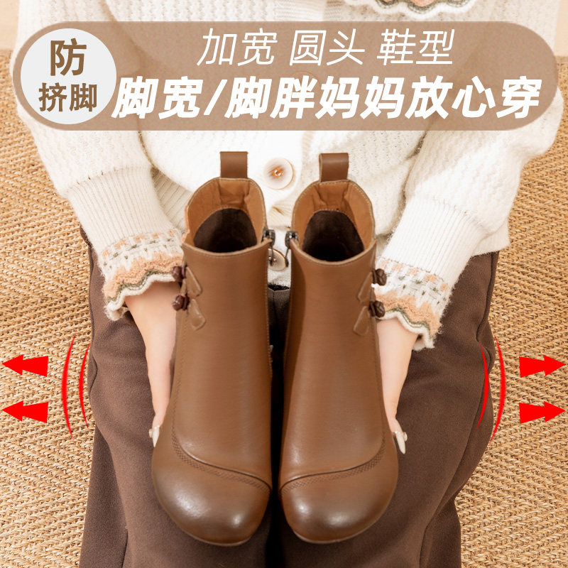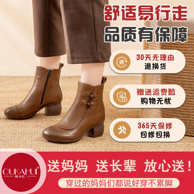 欧卡汇冬季真皮加绒妈妈鞋子舒适休闲短靴女鞋女中老年粗跟女靴子