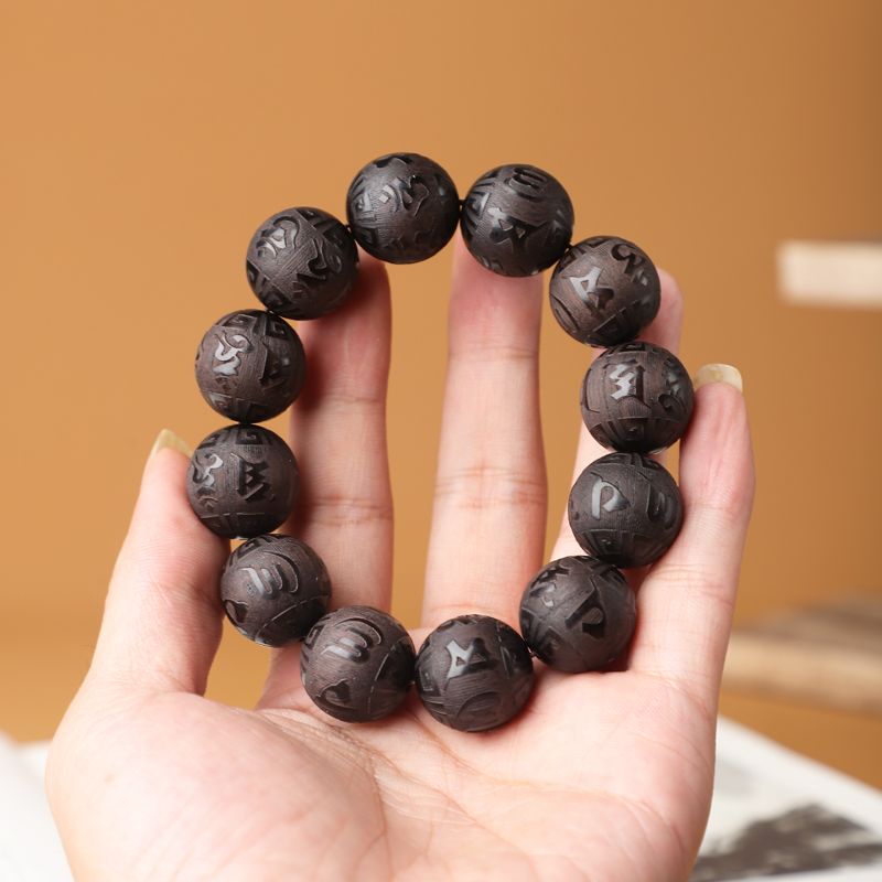 天然黑檀木雕刻文玩佛珠手串六字箴言高密紫光檀乌木手链男女士款