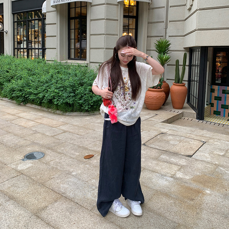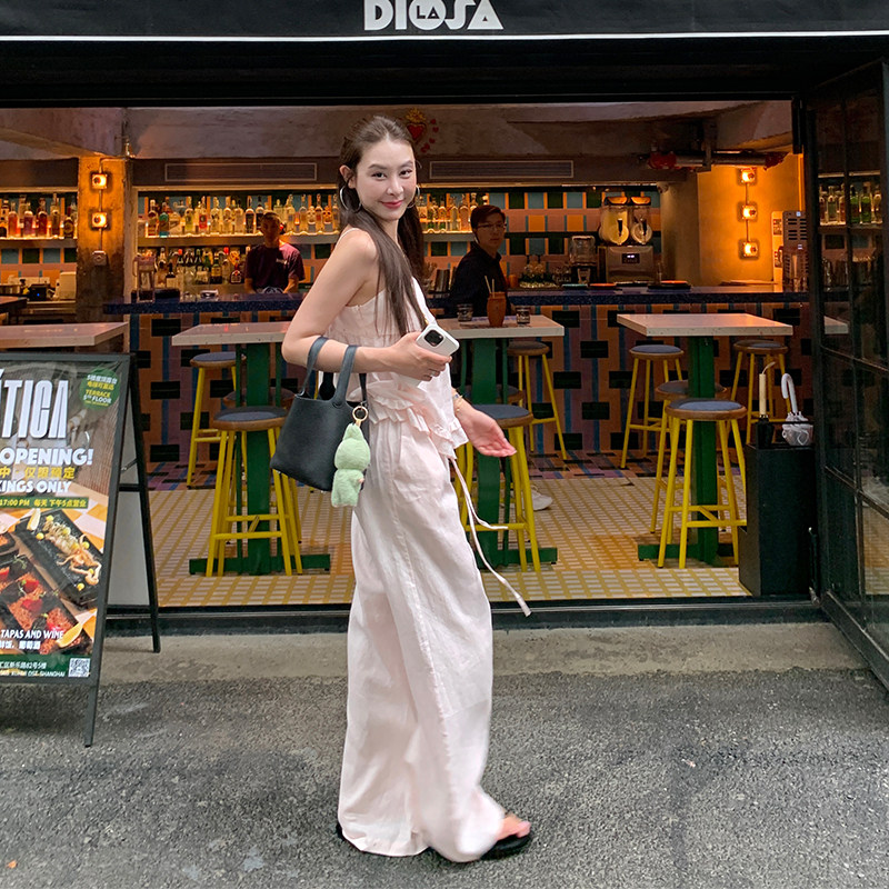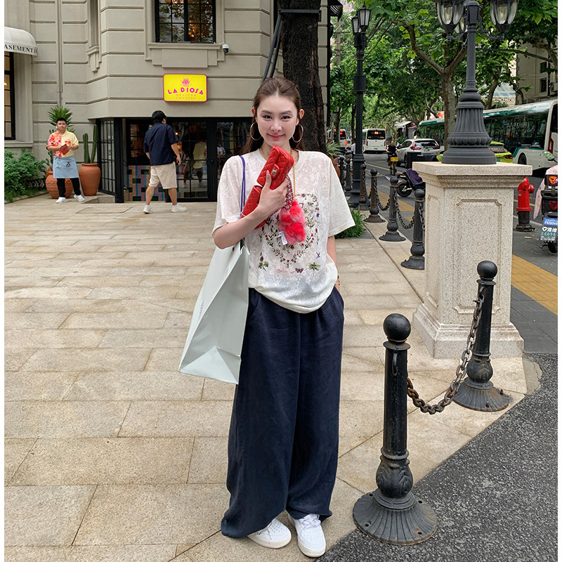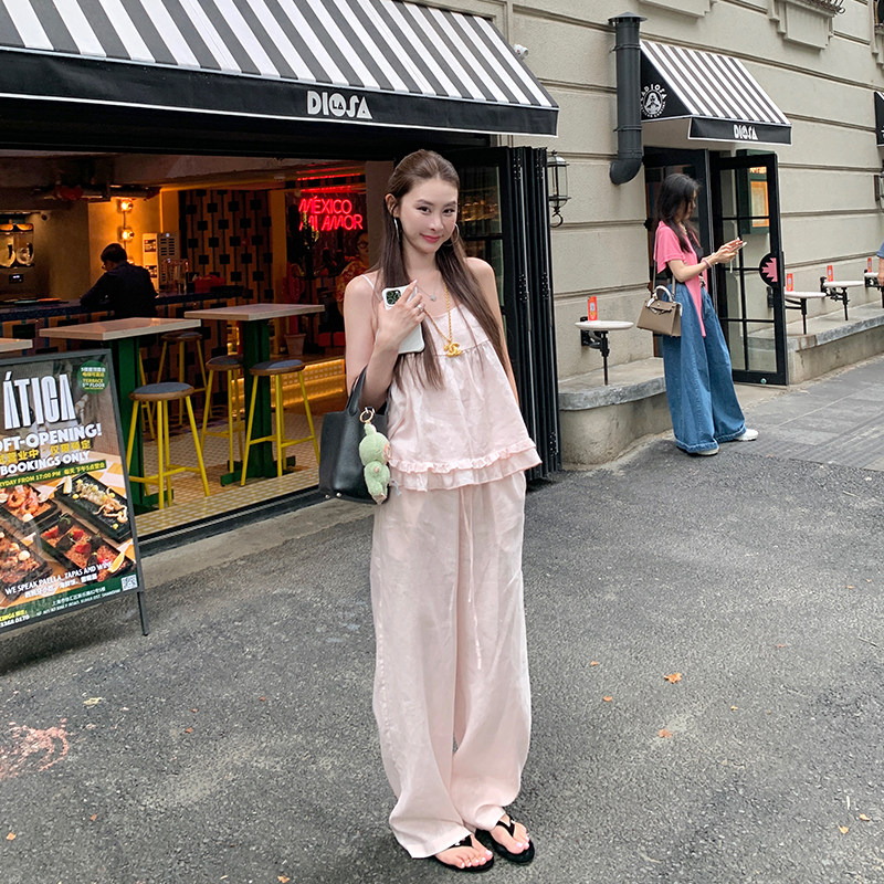 tingtings 粉色亚麻裤子女夏季新款阔腿裤垂感休闲裤宽松拖地长裤