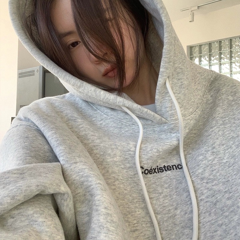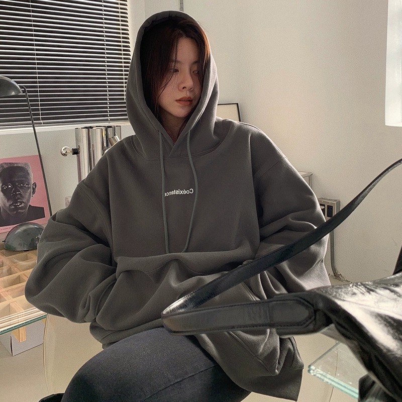 100%纯棉美式灰色连帽卫衣女秋冬加绒加厚慵懒风宽松oversize外套