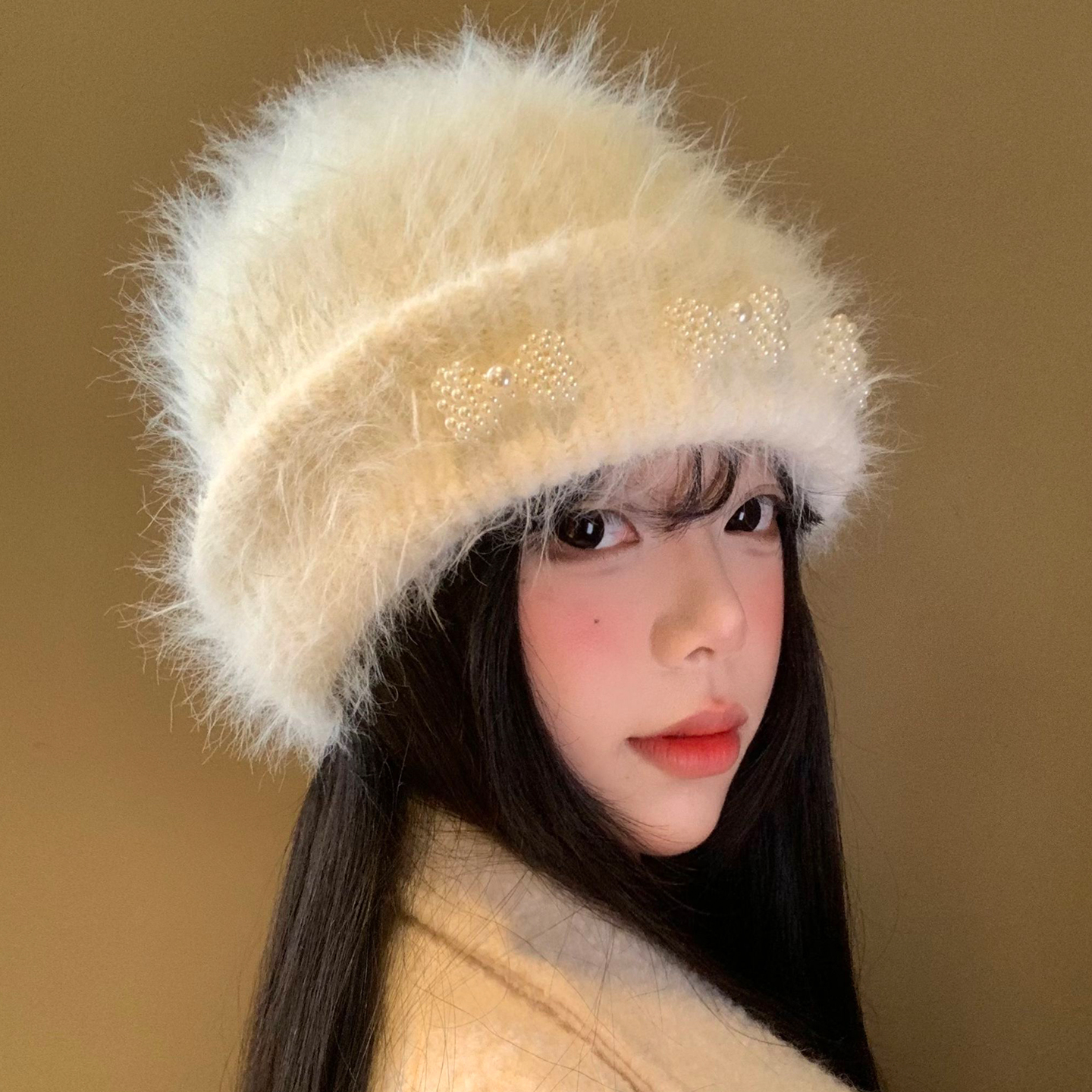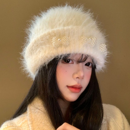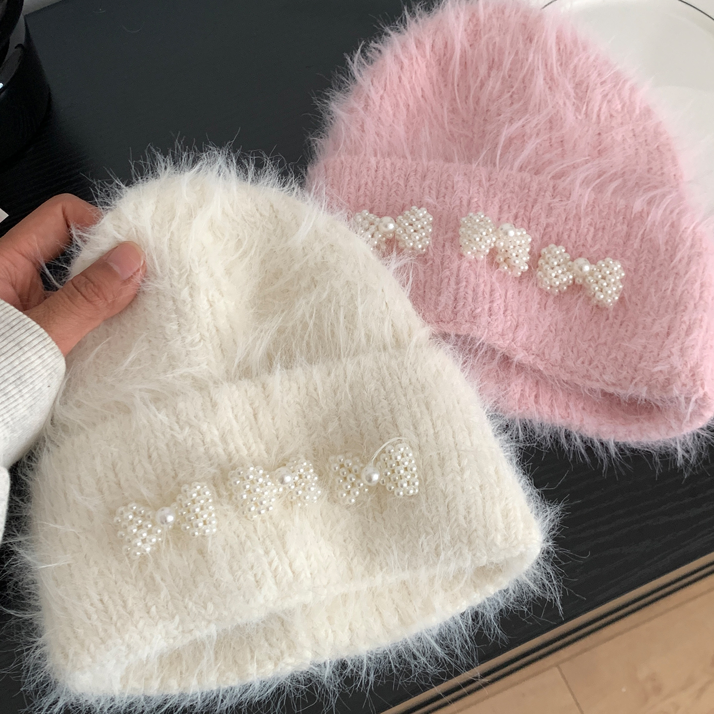 珍珠蝴蝶结毛绒针织帽韩版显脸小