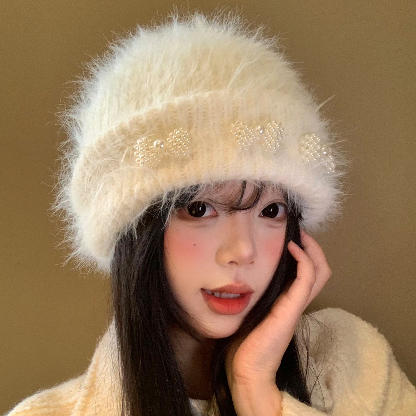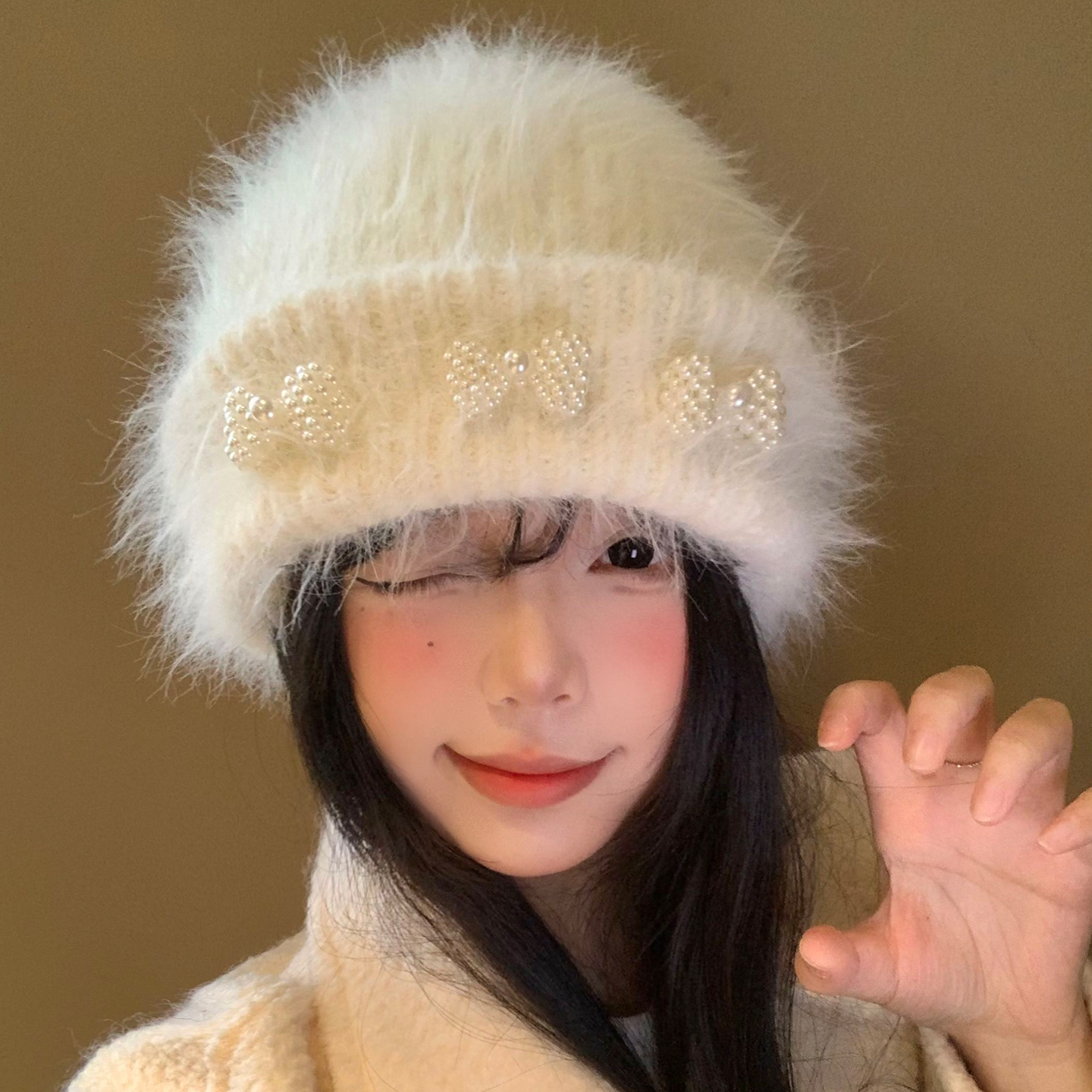 珍珠蝴蝶结毛绒针织帽女秋冬韩版显脸小毛线帽大头围保暖护耳帽子