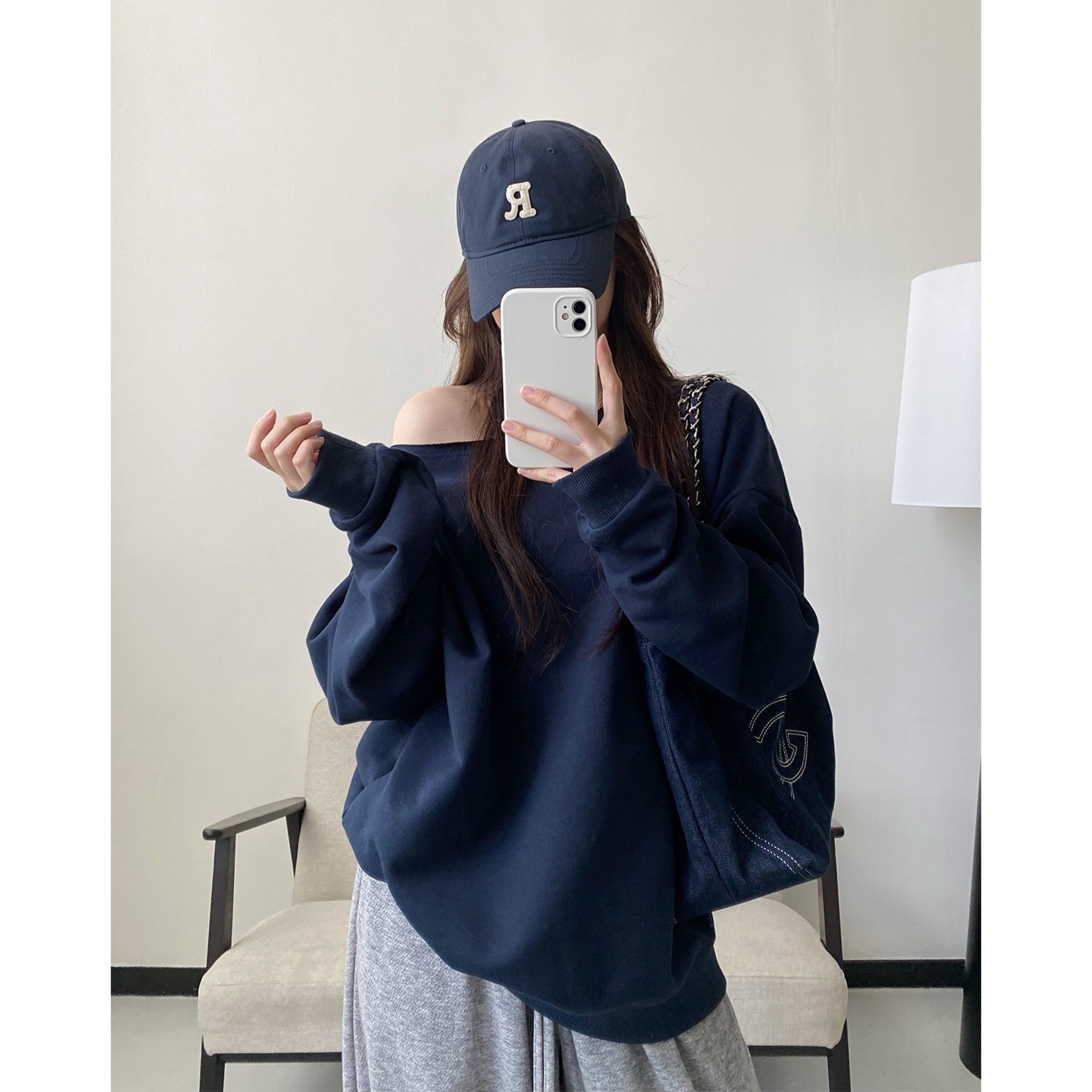 露肩斜肩款宽松长袖卫衣上衣女