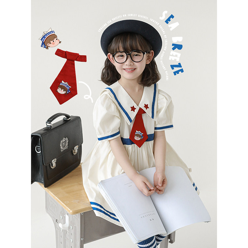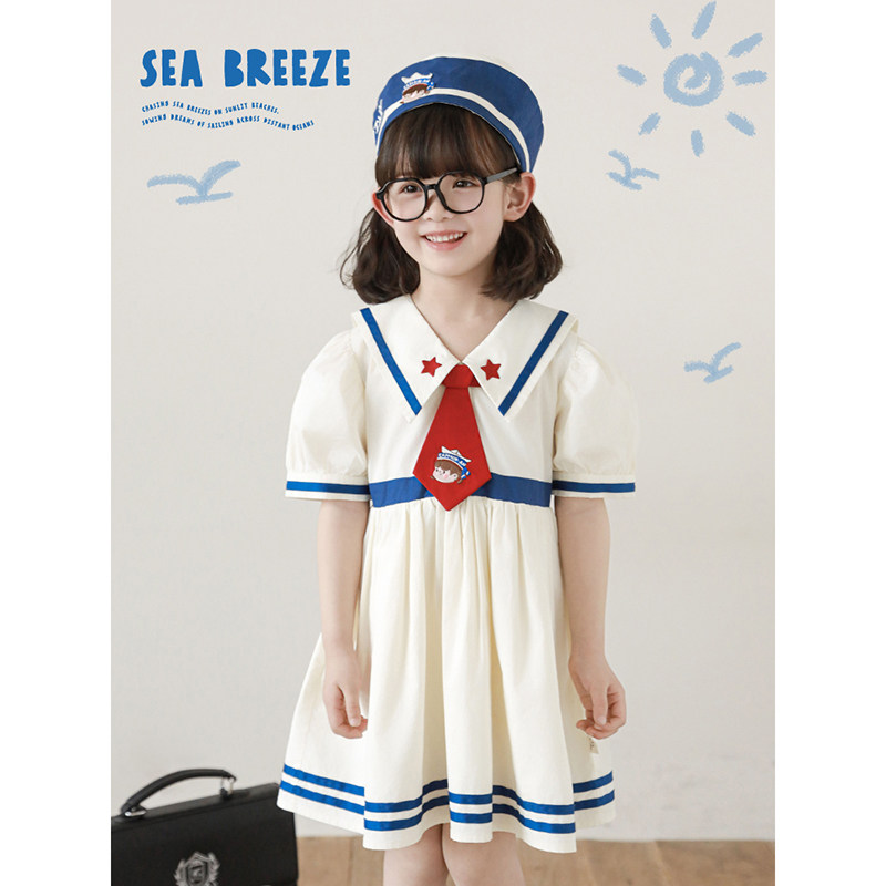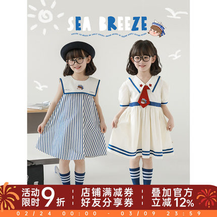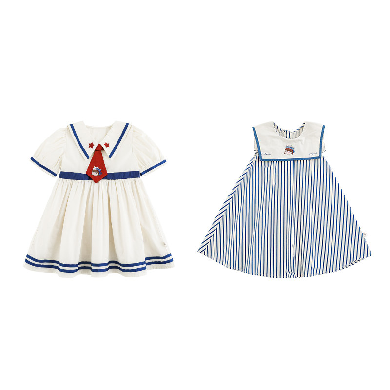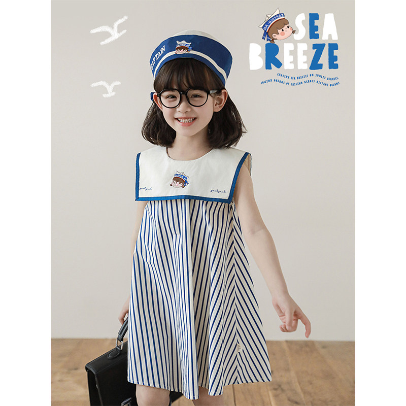 幼悠 女童夏季巡海梦想家撞色织带海军刺绣连衣裙/蓝白条纹背心裙