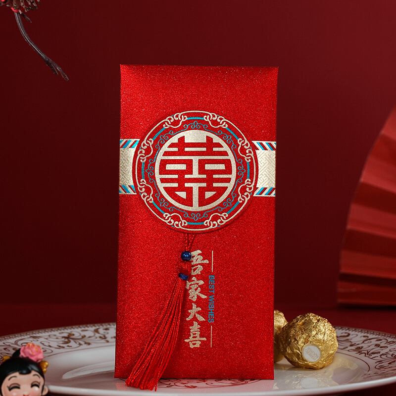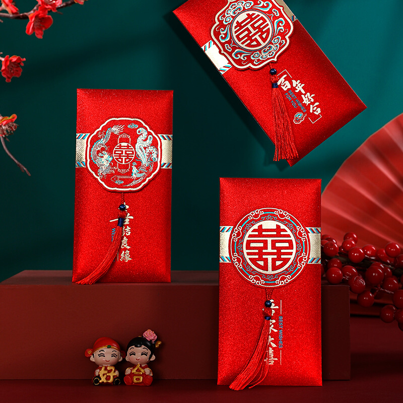 批发结婚用品新款中式硬纸磨砂质感带流苏红包喜字千元万元利是封