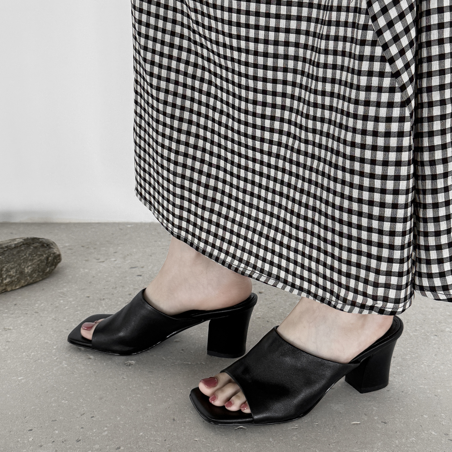 开怀依足黑色羊皮高跟拖鞋女外穿夏季2025新款软真皮时尚方头粗跟