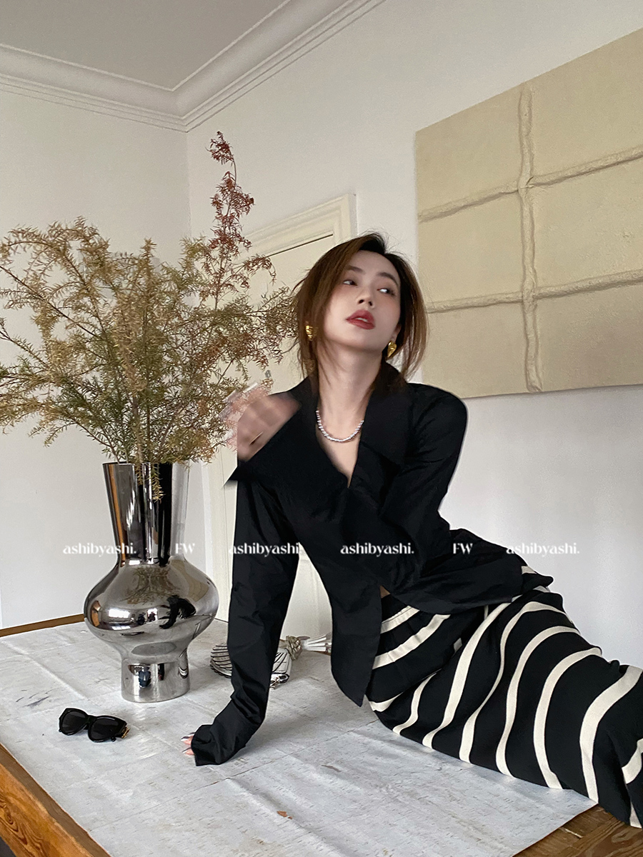 大于诗集 V领收腰遮肉显瘦白衬衫女慵懒风喇叭袖修身打底纯棉衬衣