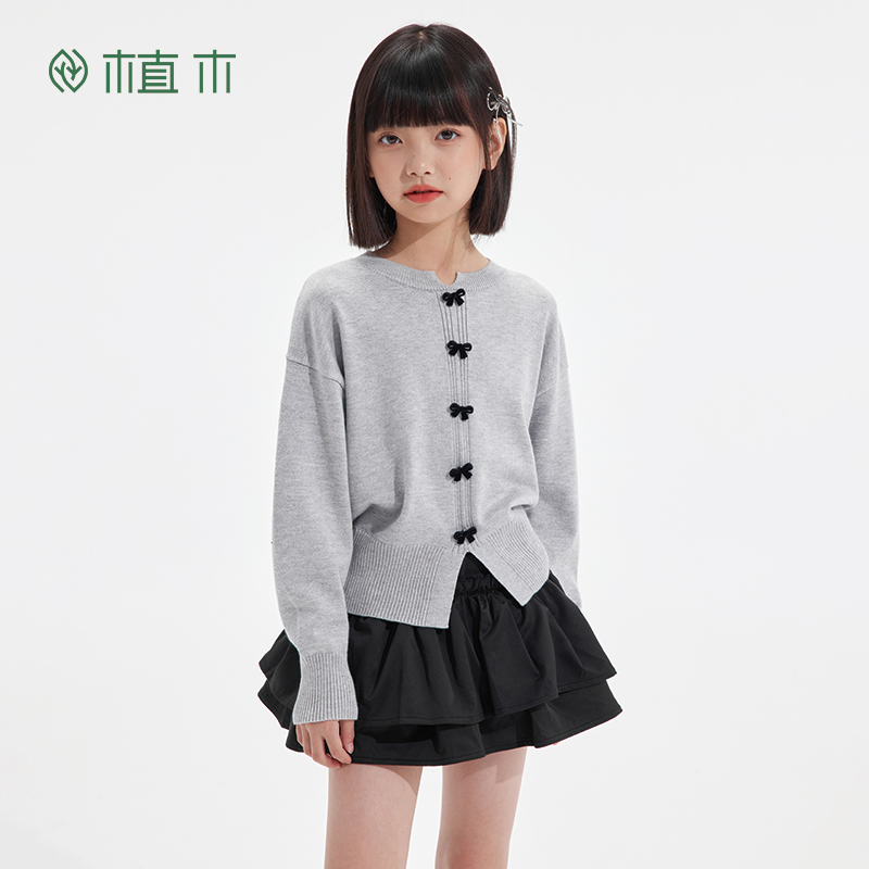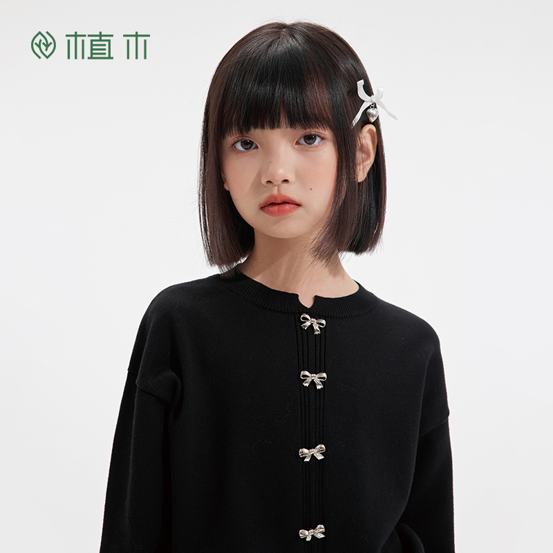 植木童装女童毛衣2025秋冬新款中大童蝴蝶结圆领针织衫儿童卫衣