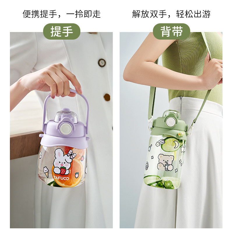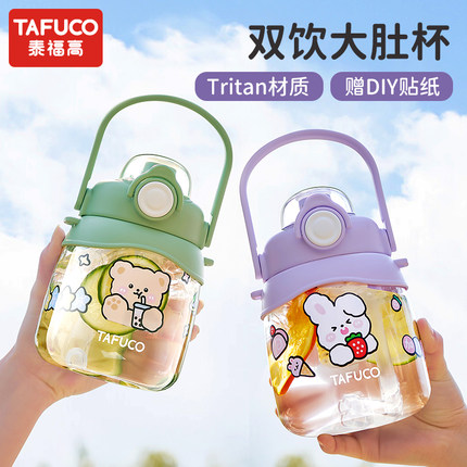 日本泰福高Tritan水杯吸管杯水壶塑料女小学生防摔便携可爱大肚杯