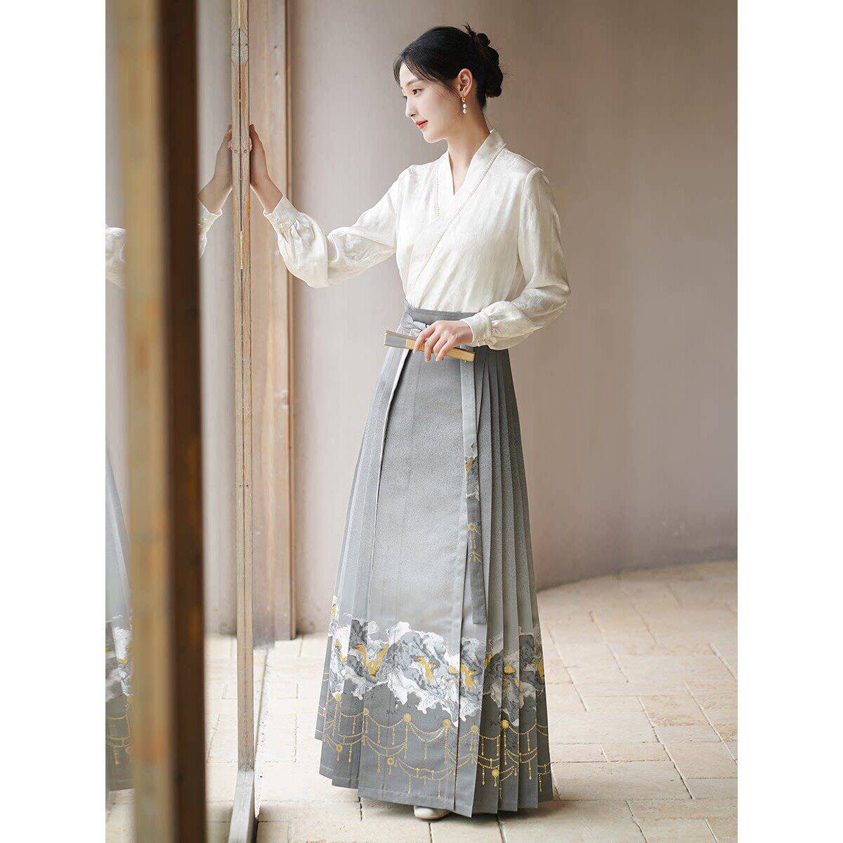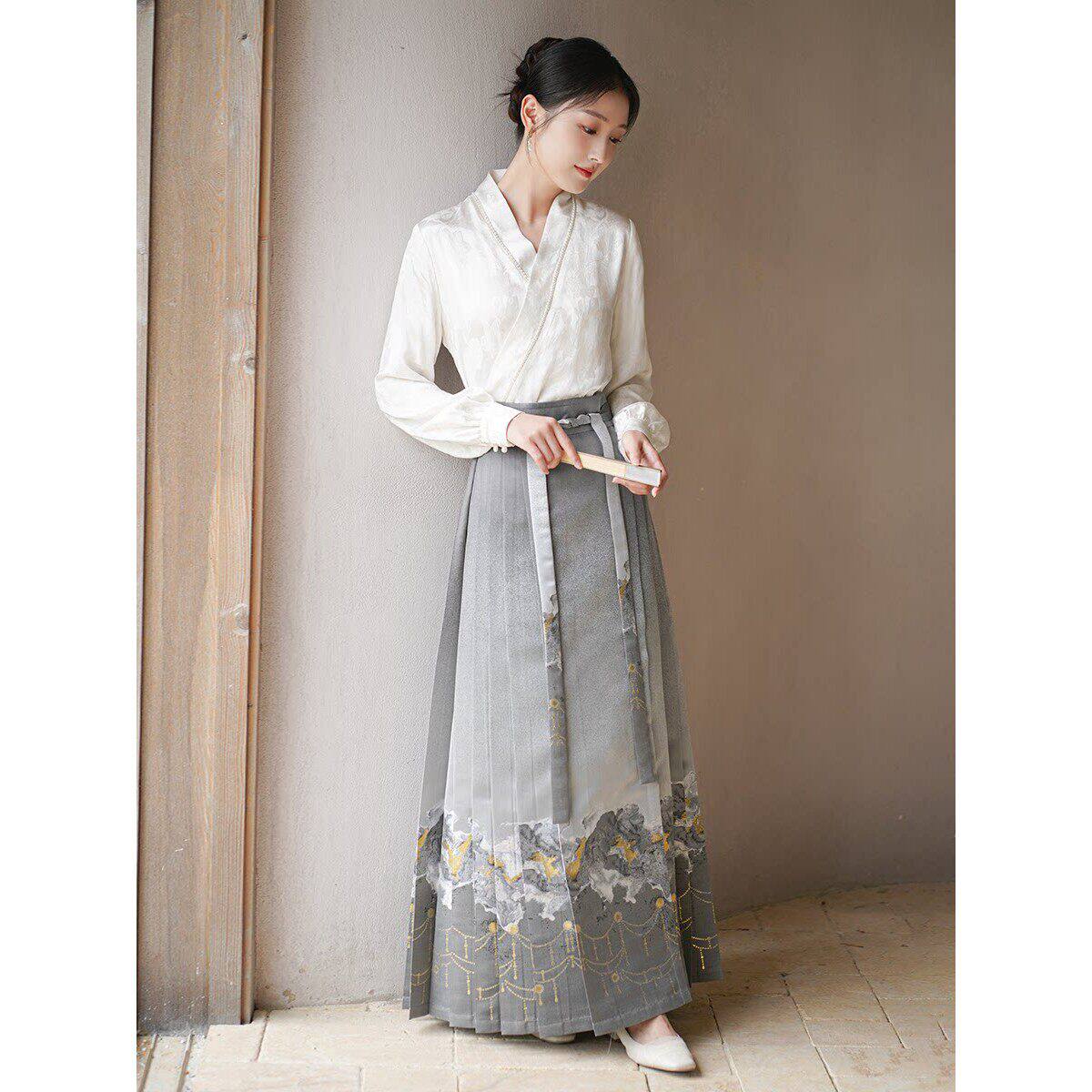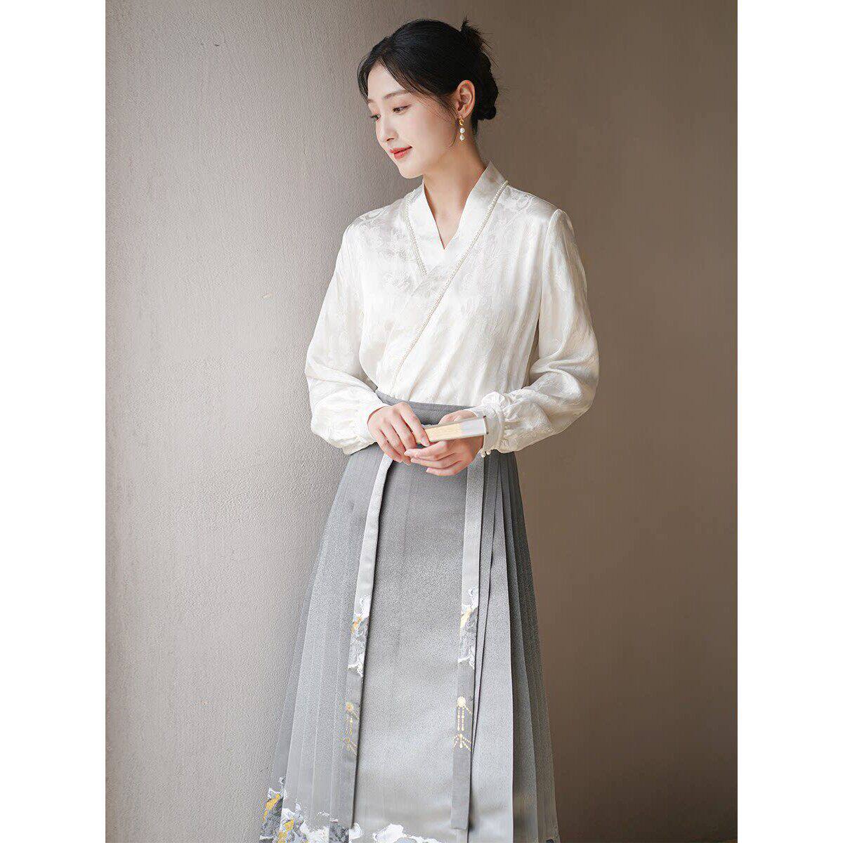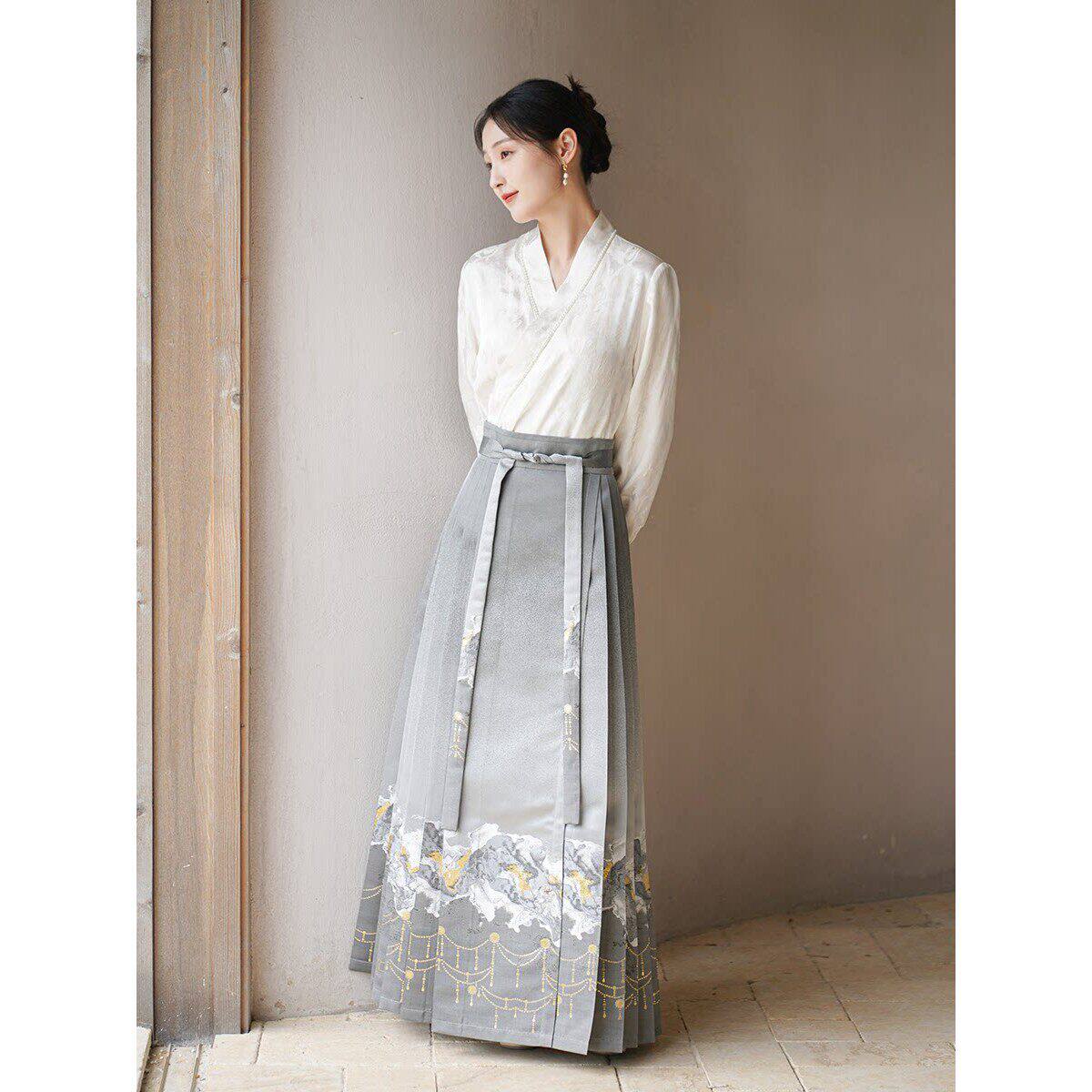 初蝉改良汉服套装女2026春季新款仙气新中式中国风织金马面裙上衣