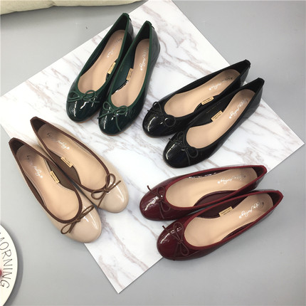 欧美春秋漆皮平底浅口低跟裸色芭蕾舞单鞋圆头蝴蝶结软底四季鞋女