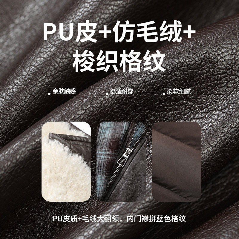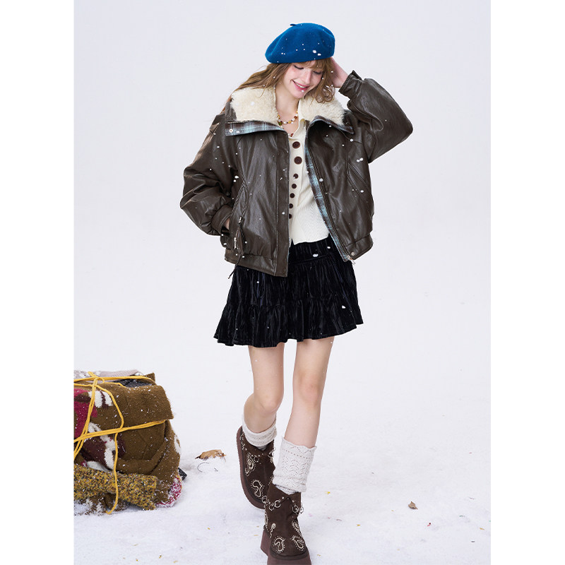 妖精的口袋复古大翻领pu皮短款鹅绒羽绒服女2025冬季新款保暖外套