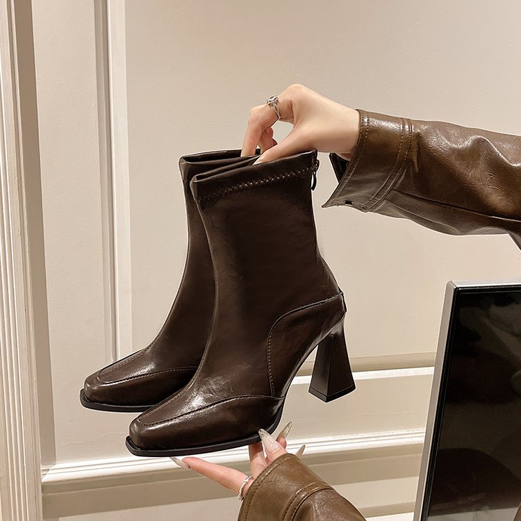 方头高跟瘦瘦靴女粗跟短靴2025秋冬新款复古马丁靴英伦风短筒单靴
