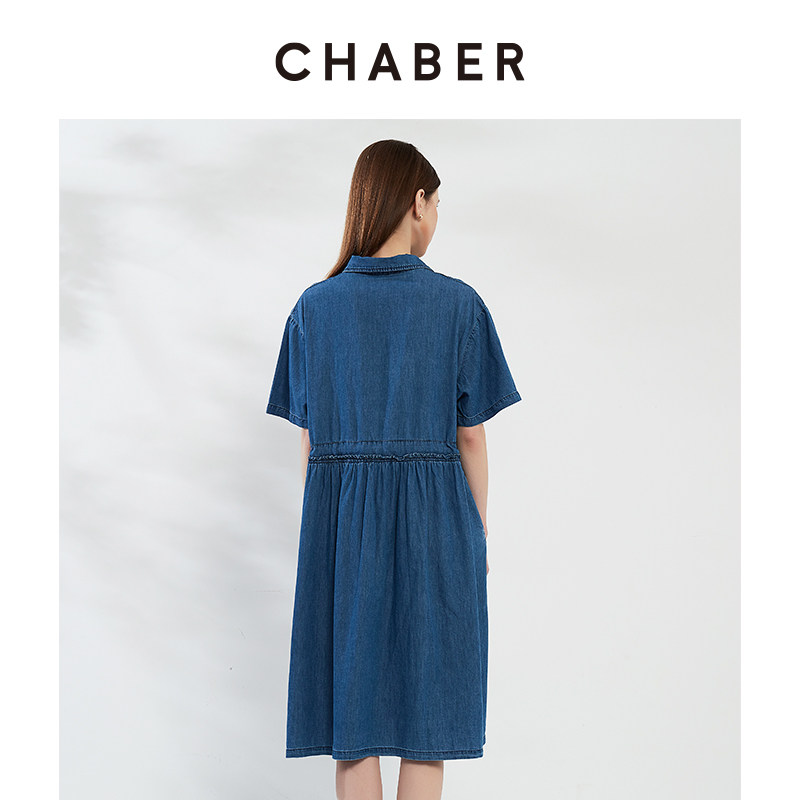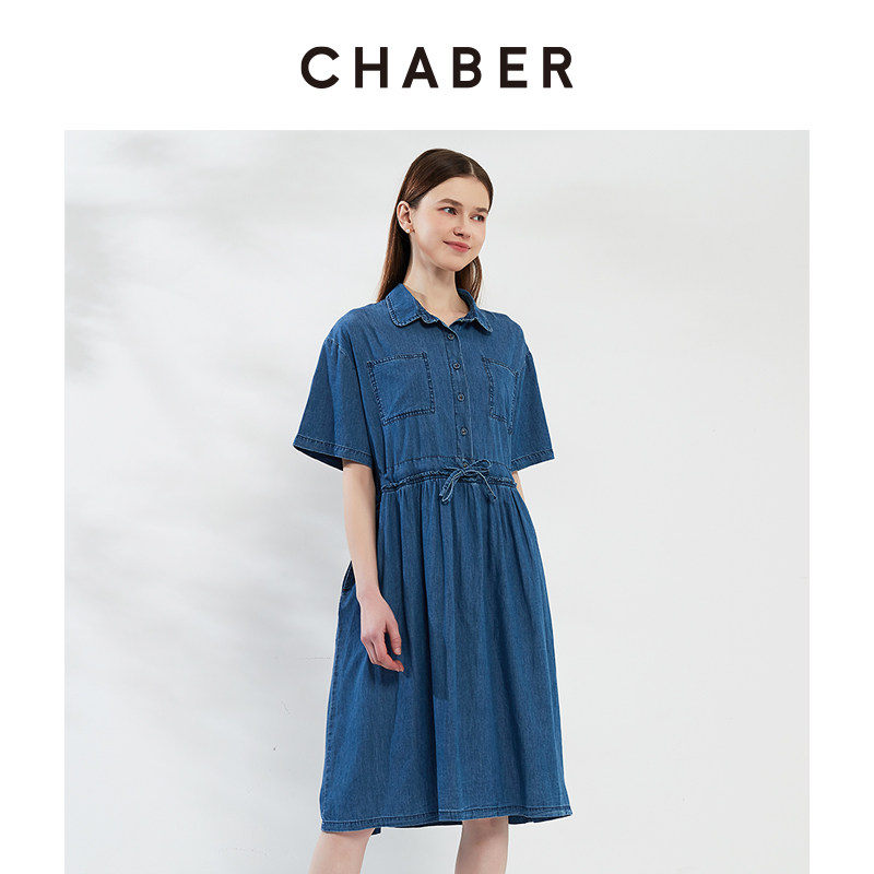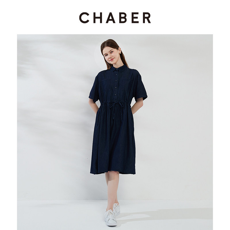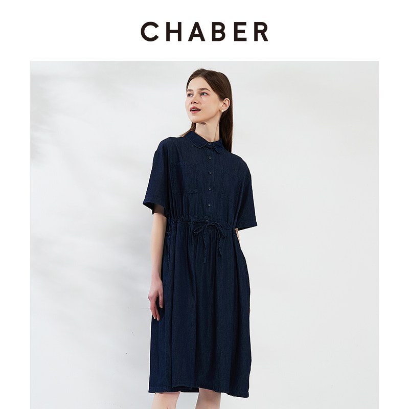 chaber巧帛夏季新款纯棉POLO领气质牛仔裙收腰抽绳中长款连衣裙