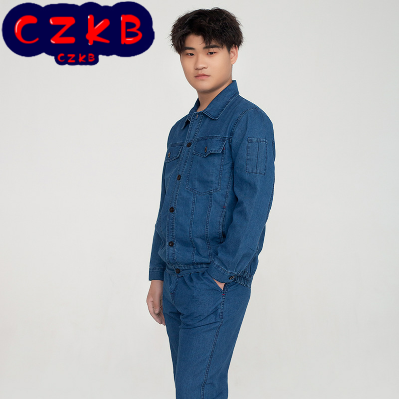 夏装薄款系扣牛仔工作服多口袋机修电焊工厂车间劳保工作服套装