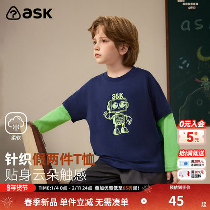 【2026春季新款】ask儿童T恤男童圆领假两件长袖中大童休闲打底衫