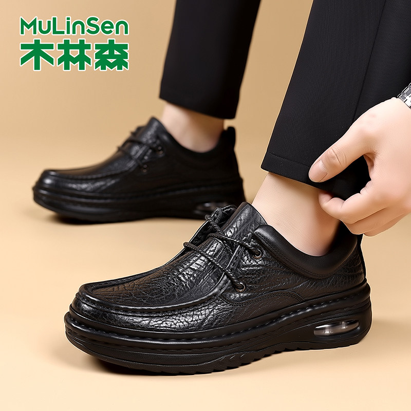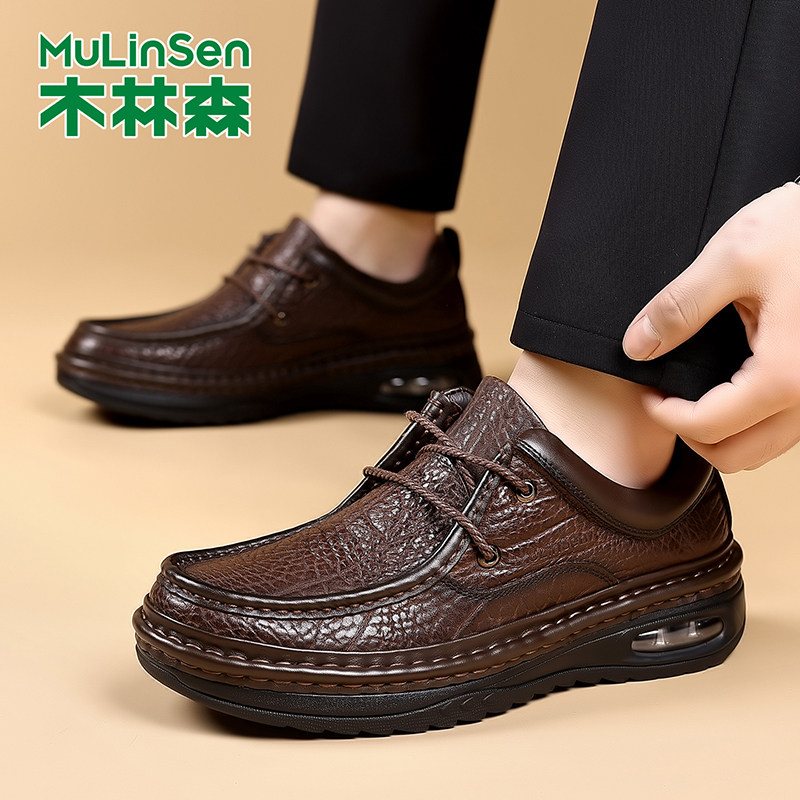 木林森男鞋真皮商务休闲皮鞋气垫减震厚底手工缝线高档头层牛皮鞋
