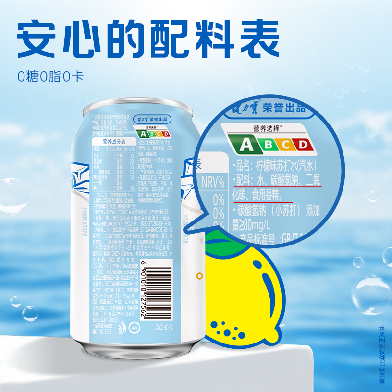 健力宝无糖苏打水柠檬味汽水330ml*12罐0糖0脂0卡0负担解腻清爽