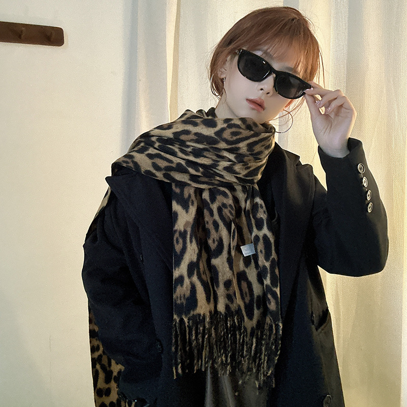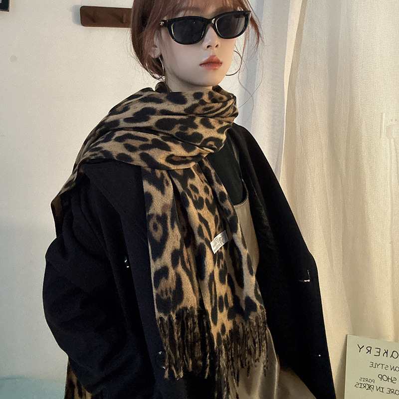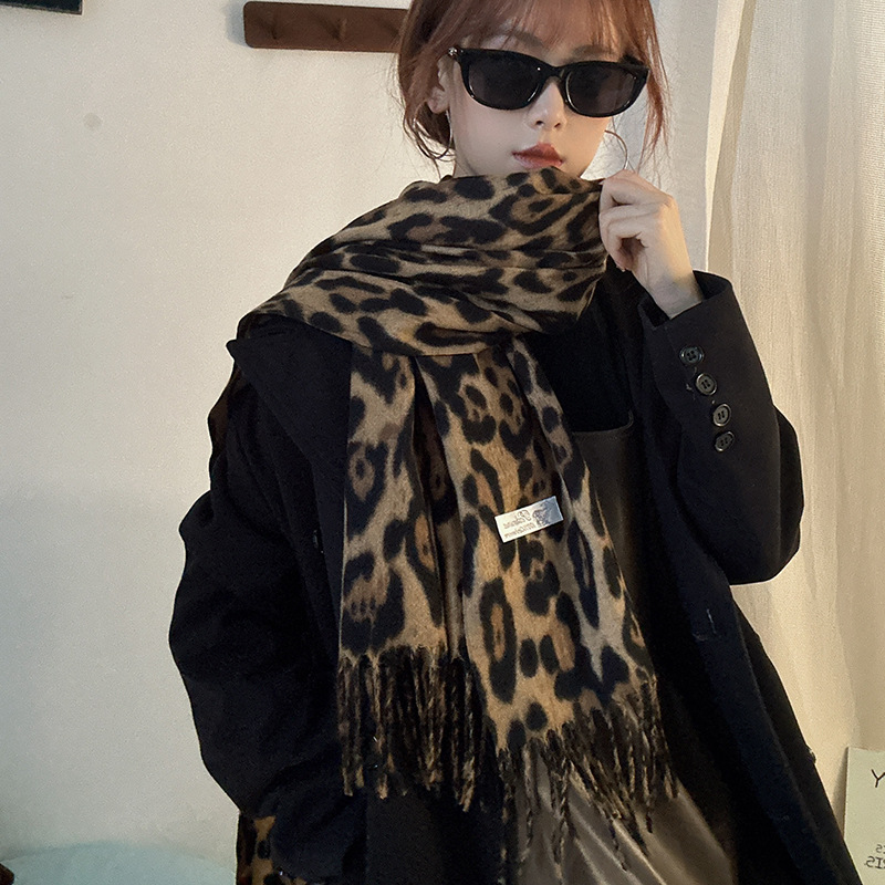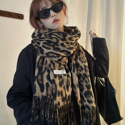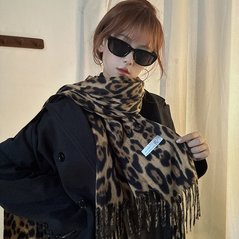 千禧辣妹风复古豹纹围巾女秋冬新款保暖加厚围脖仿羊绒流苏披肩