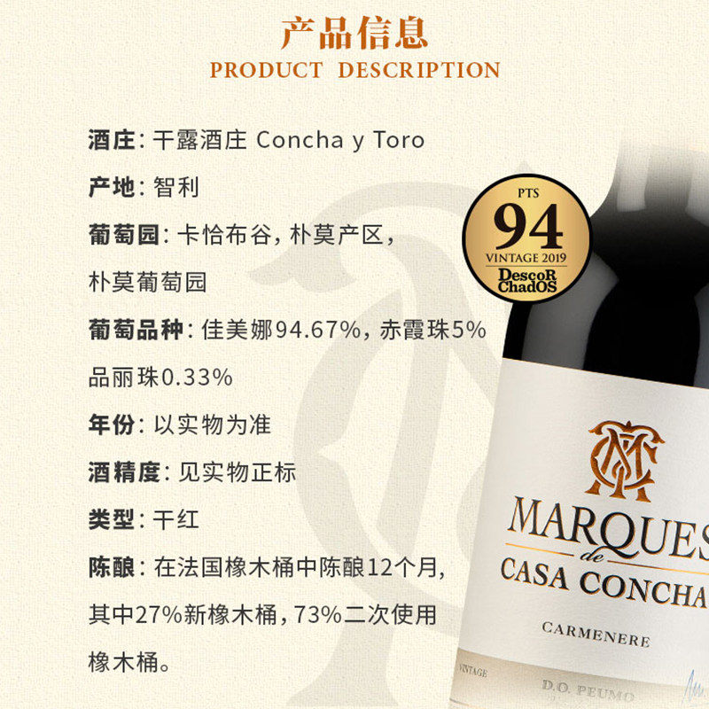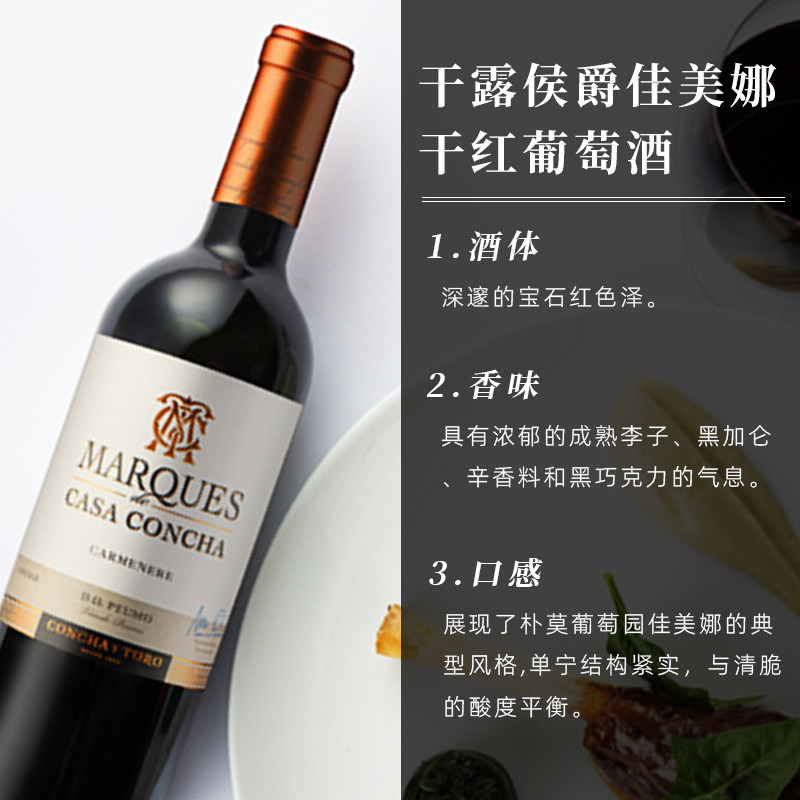 智利名庄ConchayToro干露侯爵佳美娜干红葡萄酒原瓶进口红酒