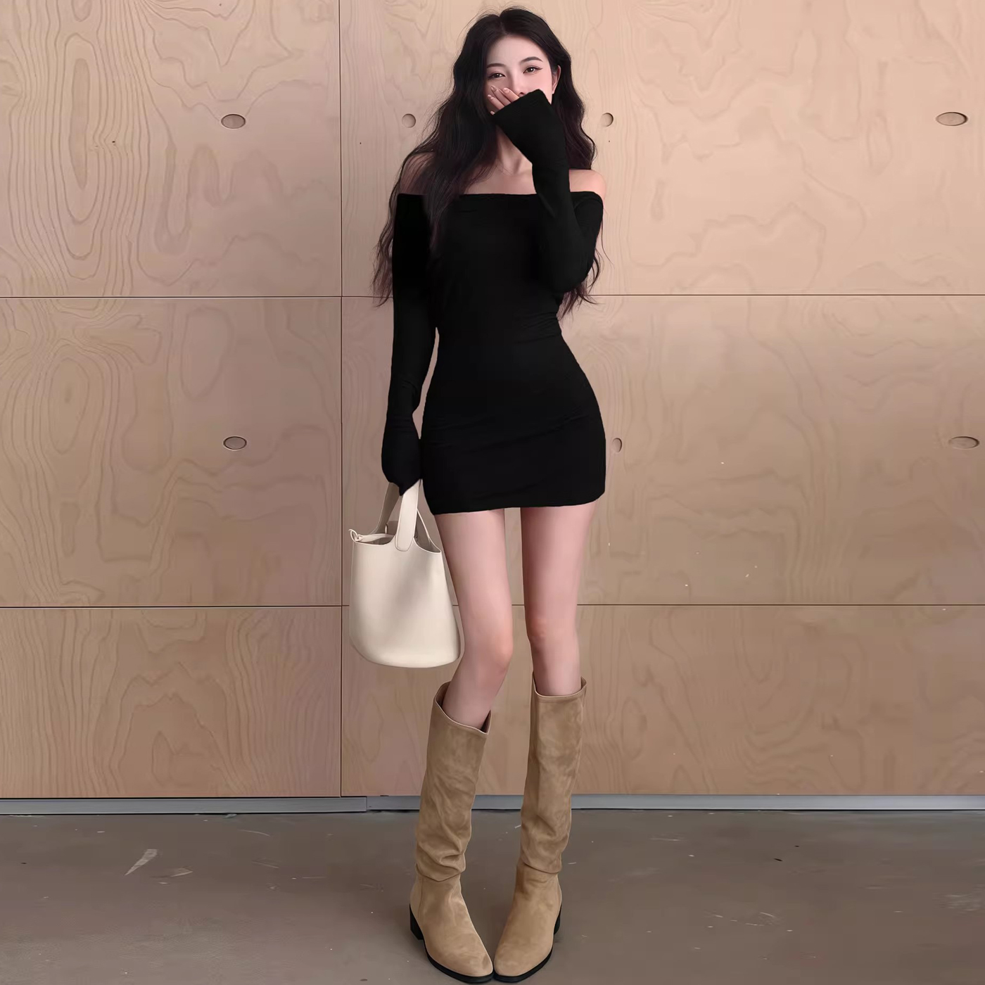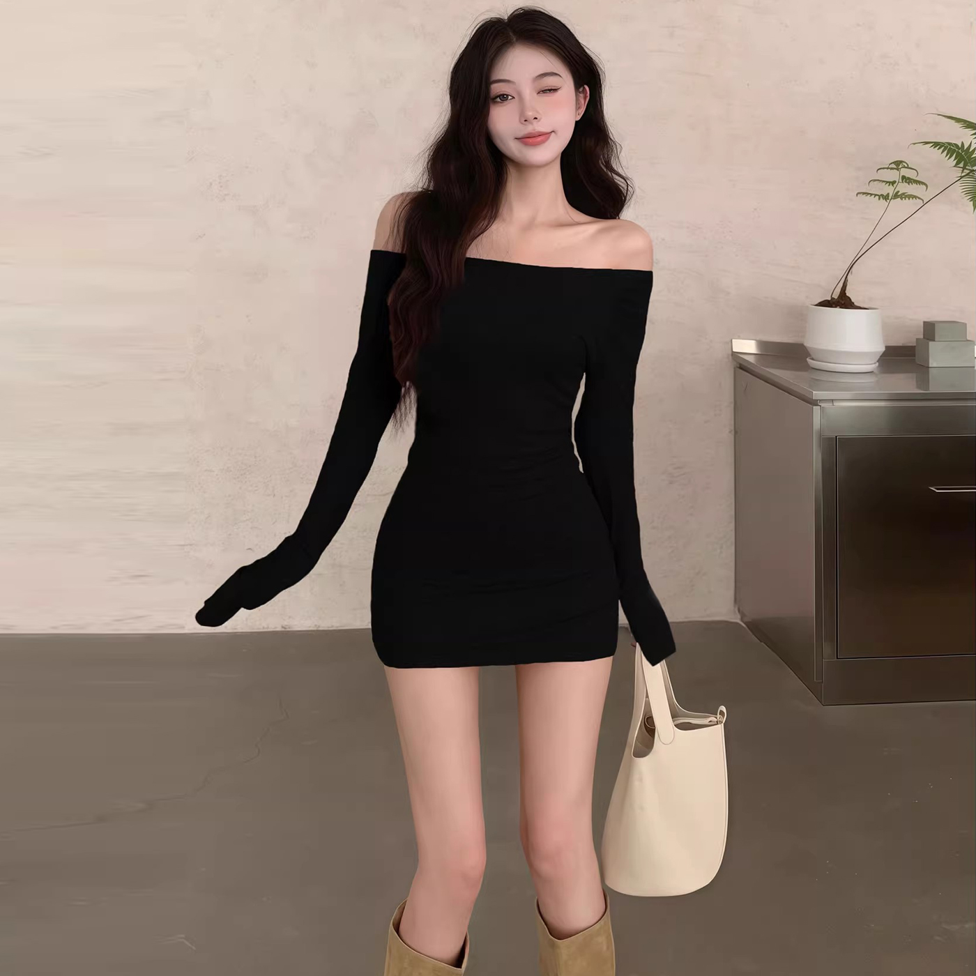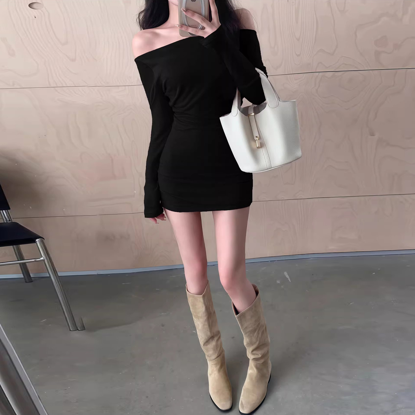 高级感辣妹一字肩长袖连衣裙女2025秋季新款修身显瘦内搭包臀裙子