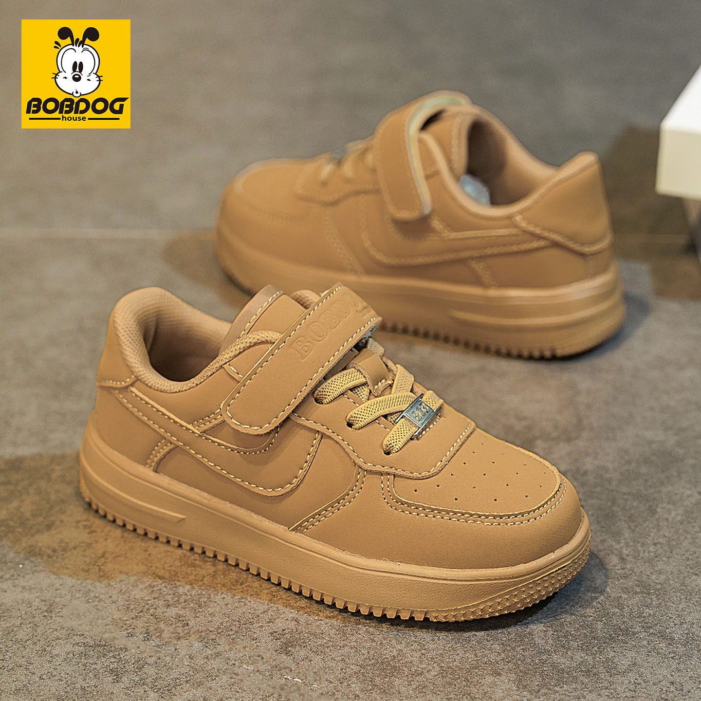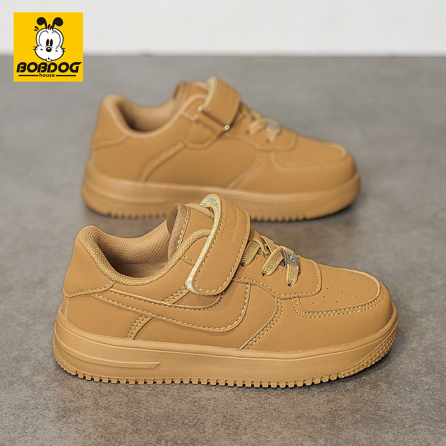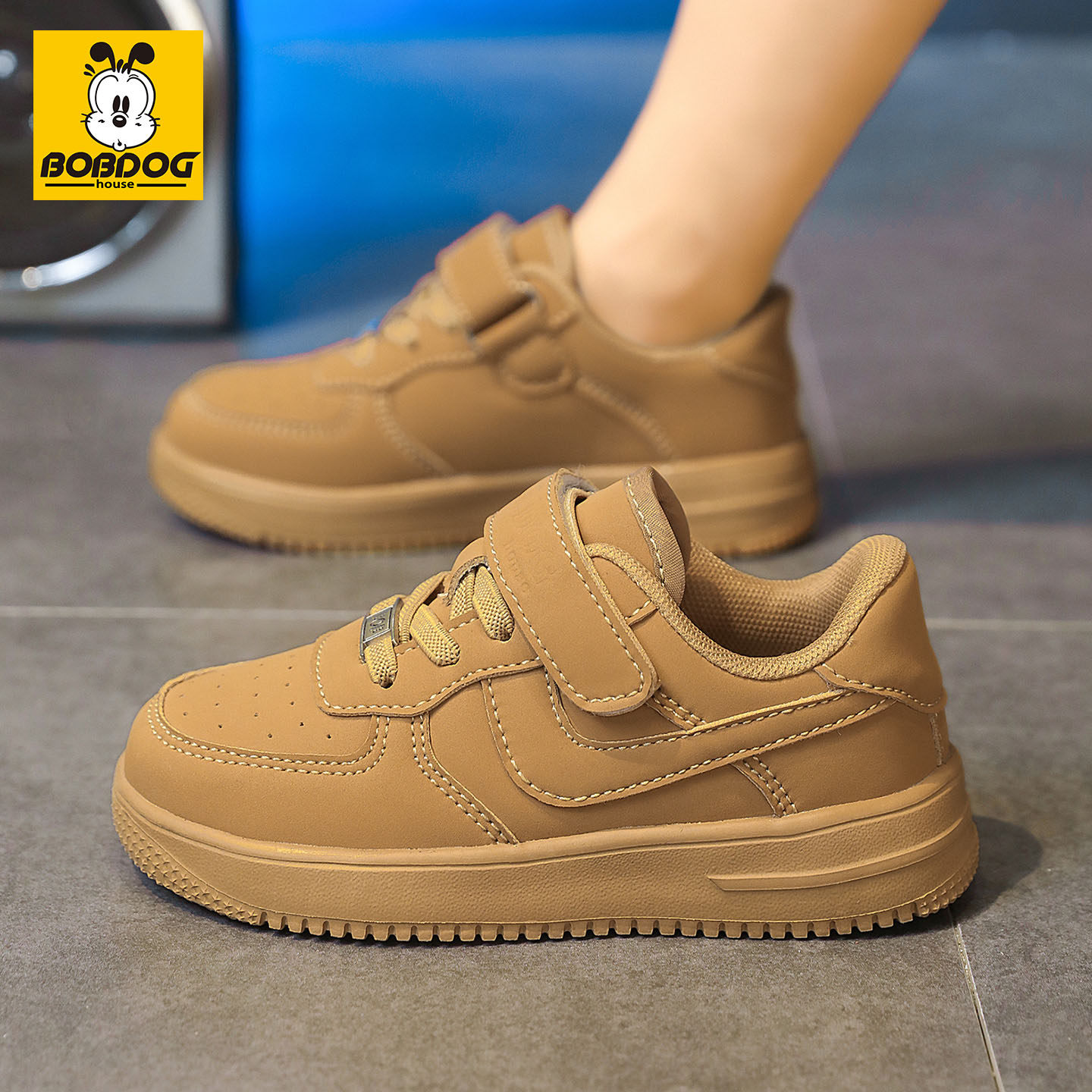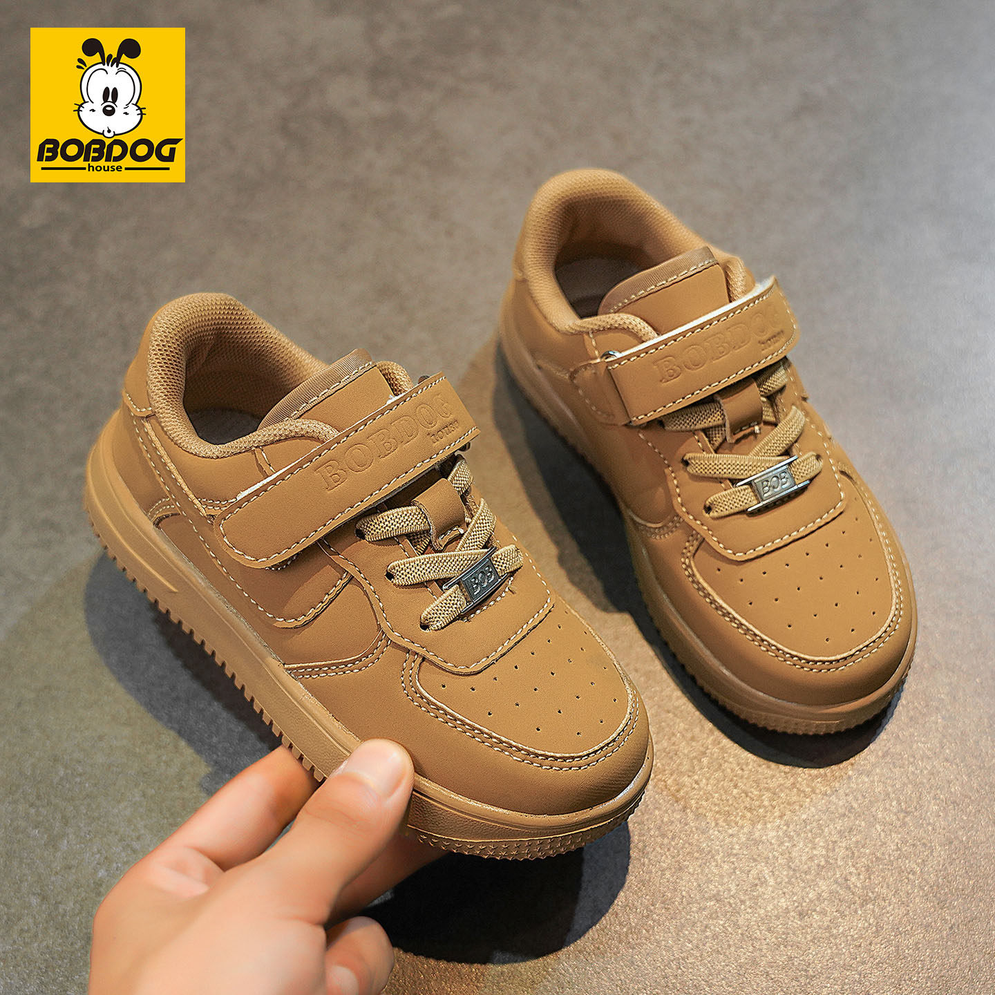 巴布豆男童鞋低帮板鞋2025新款秋季小麦色皮面鞋子女童儿童运动鞋
