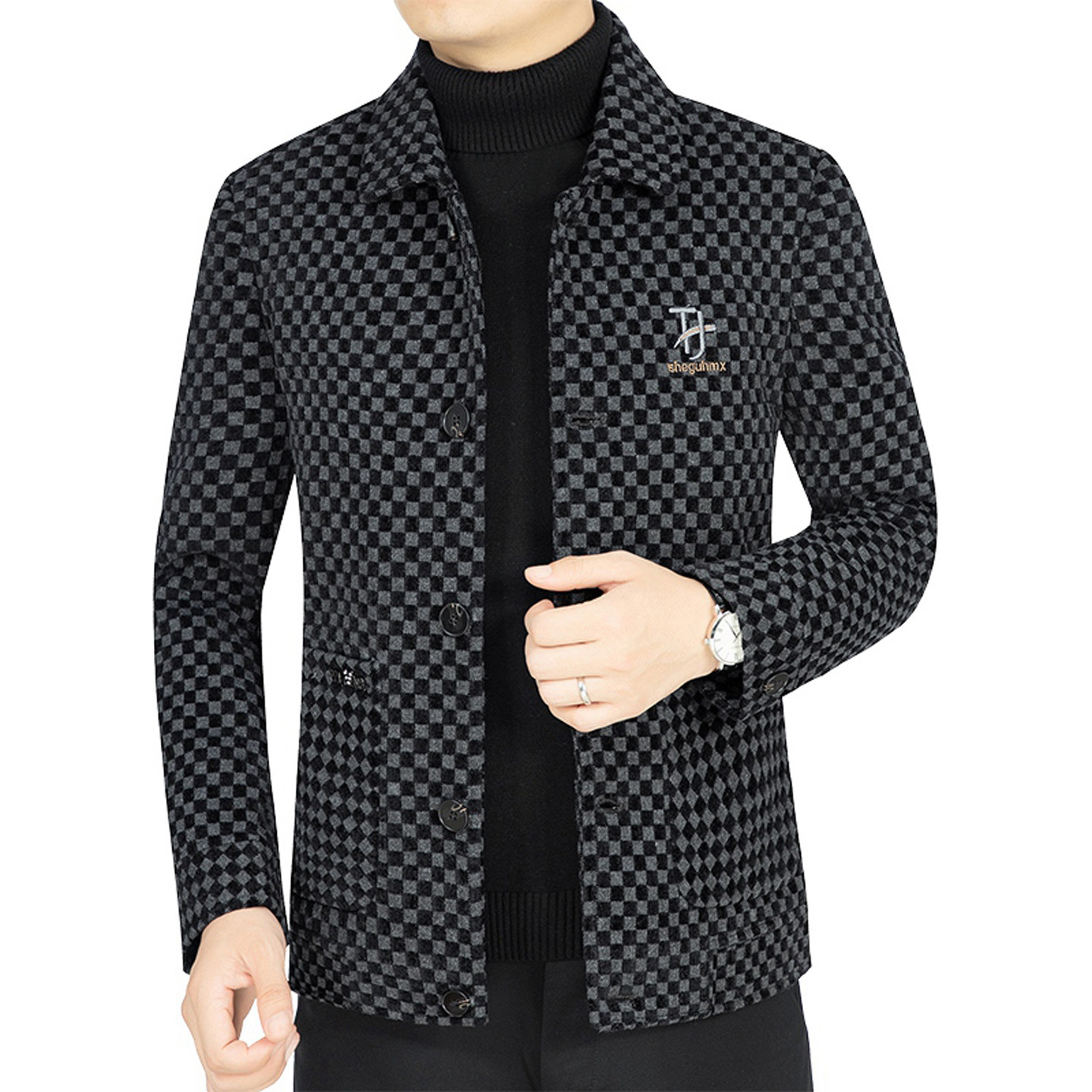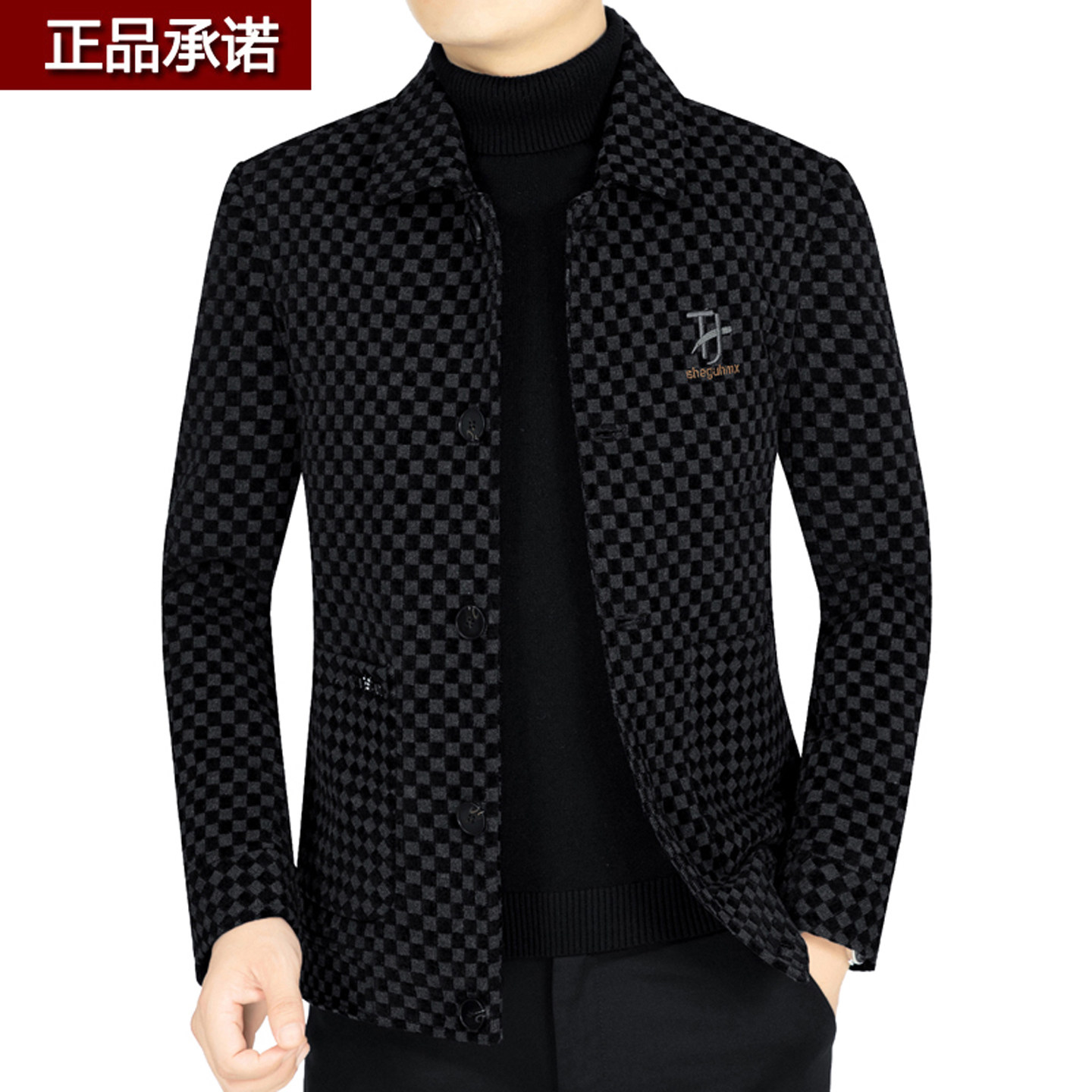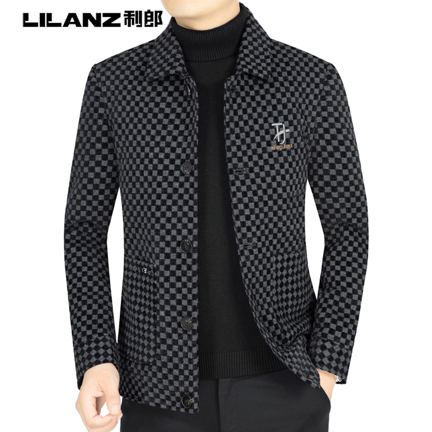 利郎商务男装夹克秋冬新款中年男士翻领格子宽松羊毛呢外套爸爸装