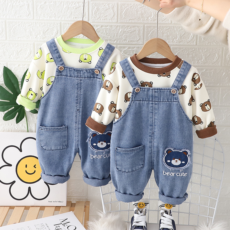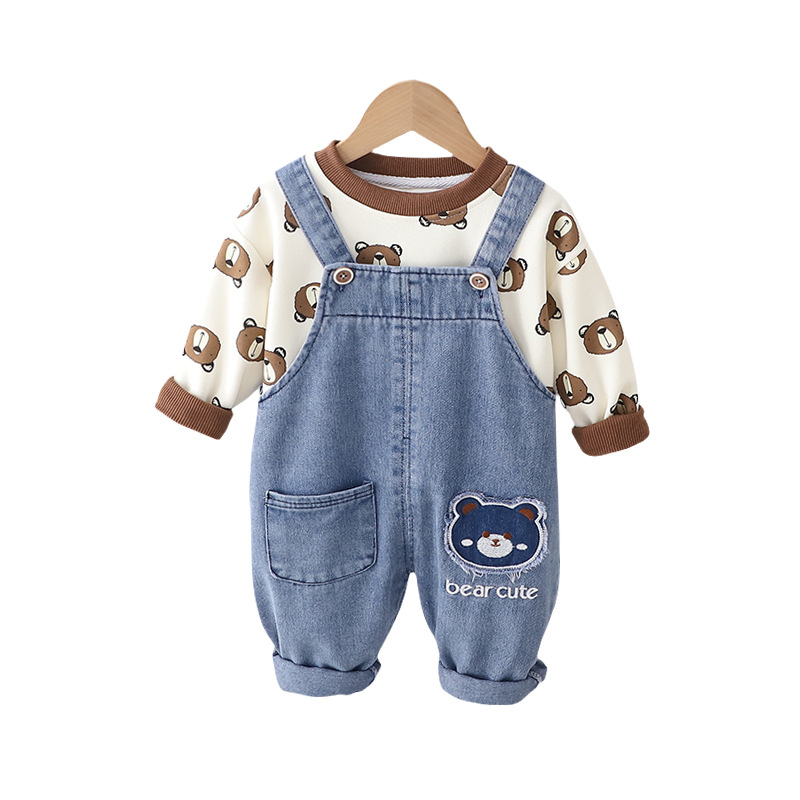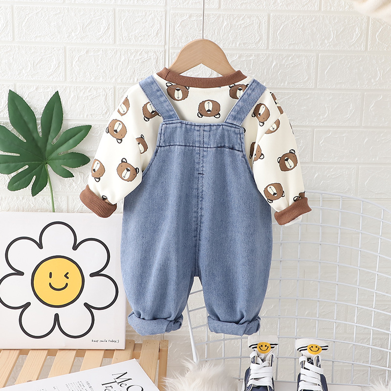 五小七童装2025春秋新款0-4岁中小童男女童熊头牛仔背带裤两件套