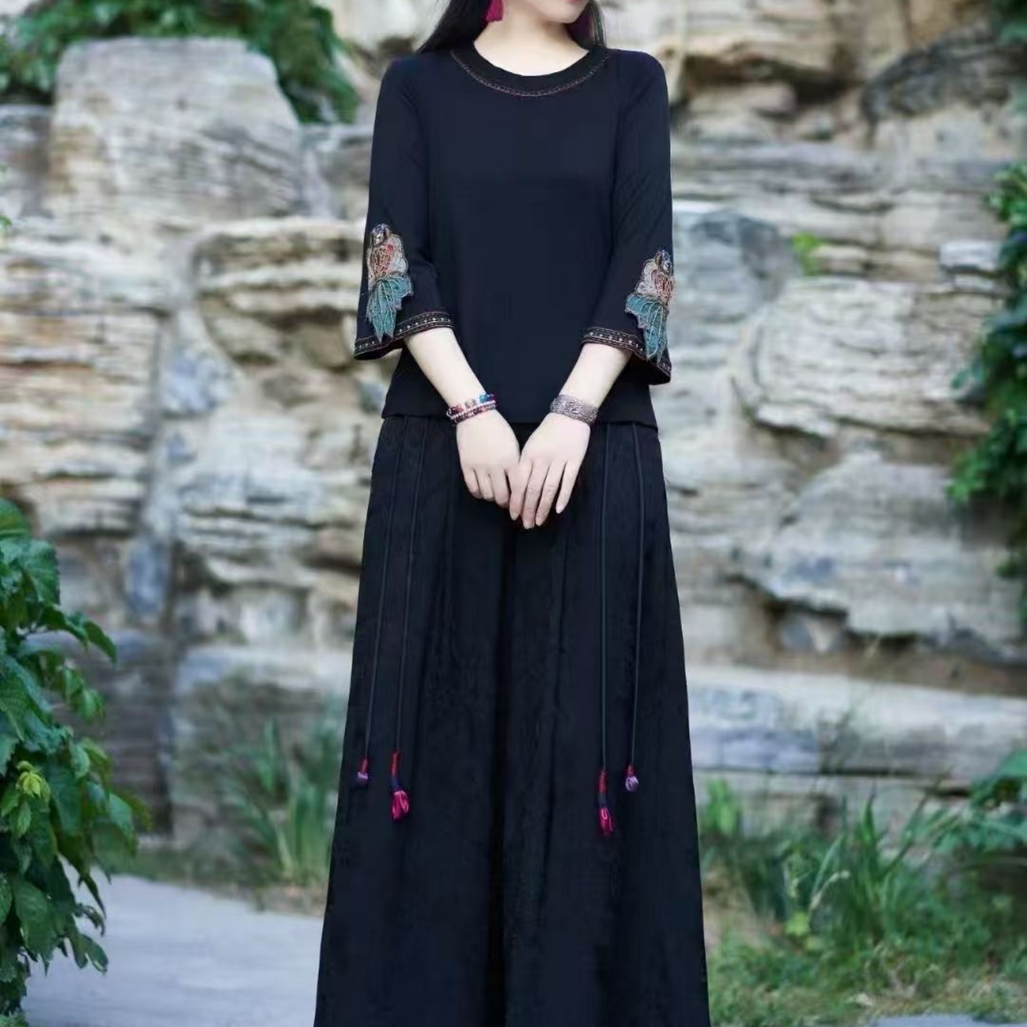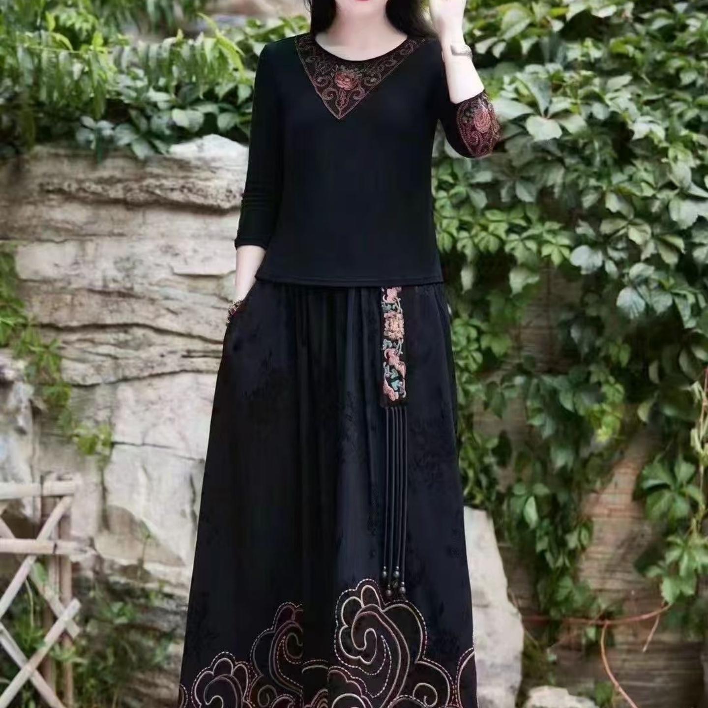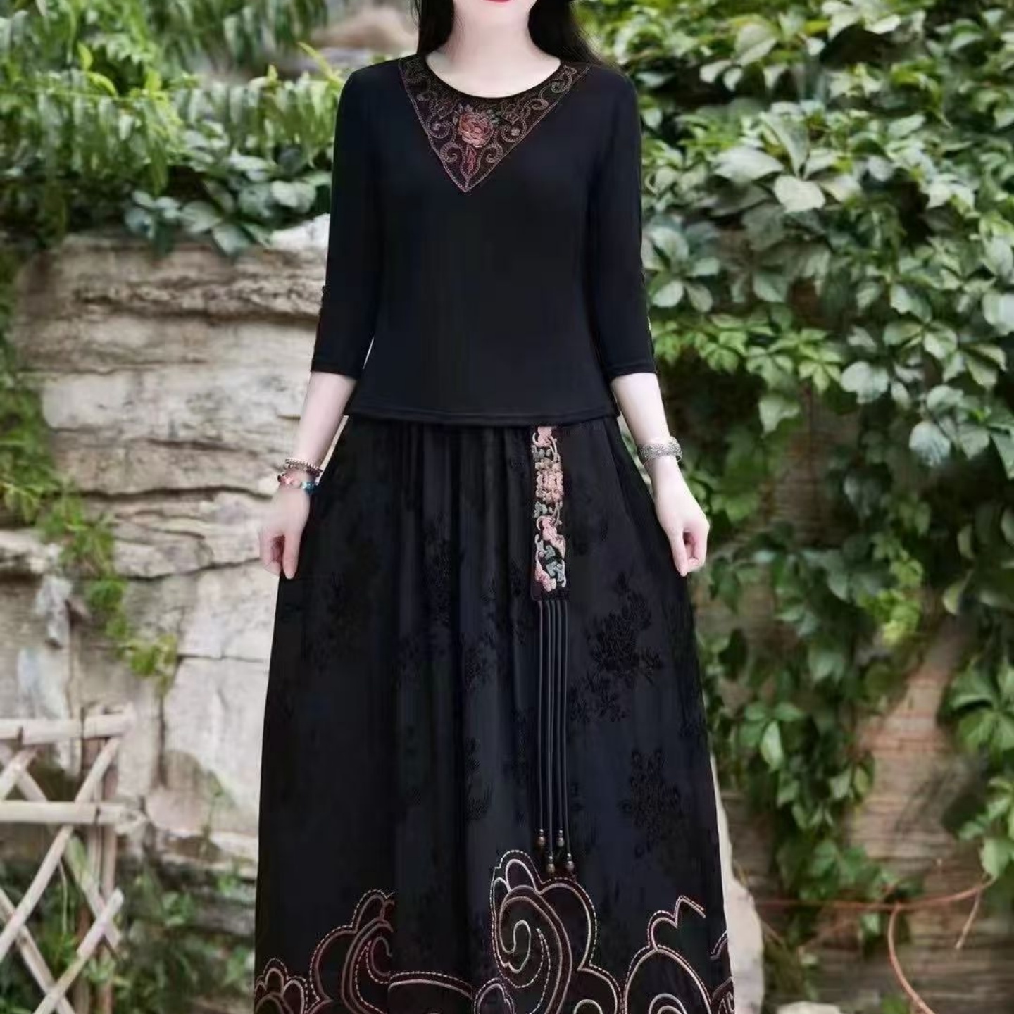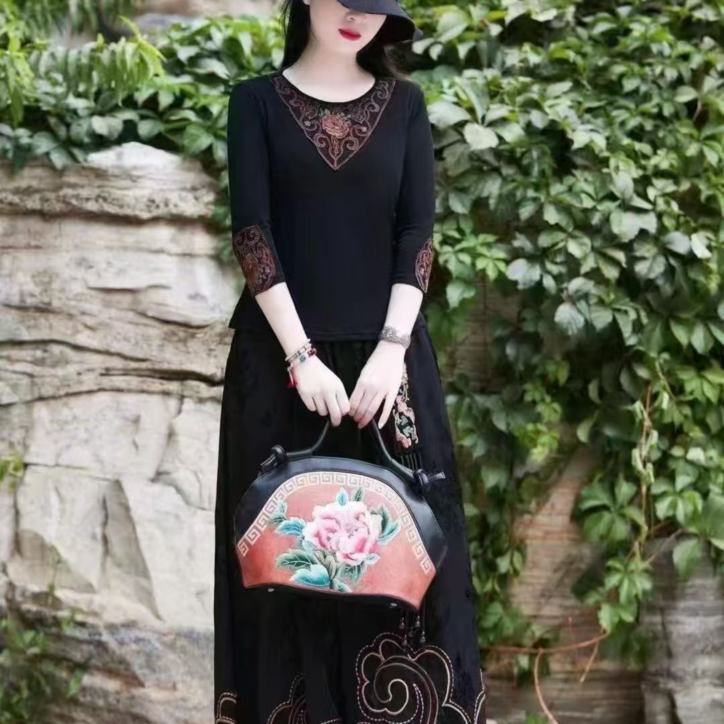 民族风七分袖新款莫代尔棉打底衫妈妈重工刺绣圆领T恤上衣