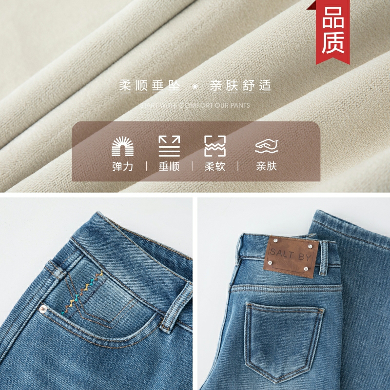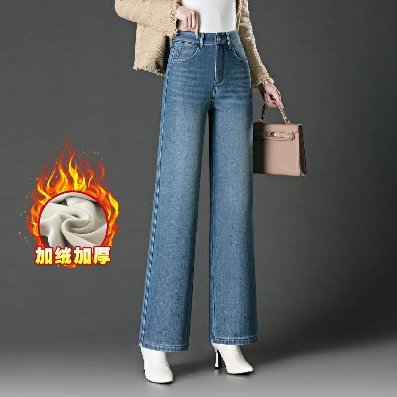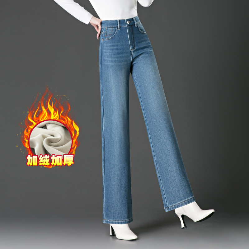 秋冬加绒直筒休闲牛仔裤子女2025高腰修身显瘦百搭窄版阔腿长裤子