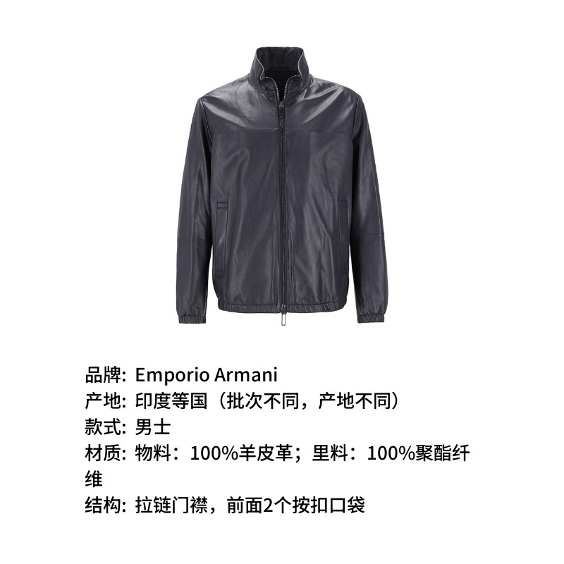 EA阿玛尼 男士羊皮革立领拉链皮衣夹克外套 01R55P 01P54